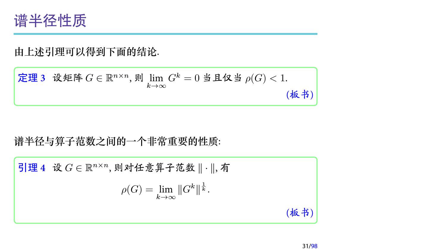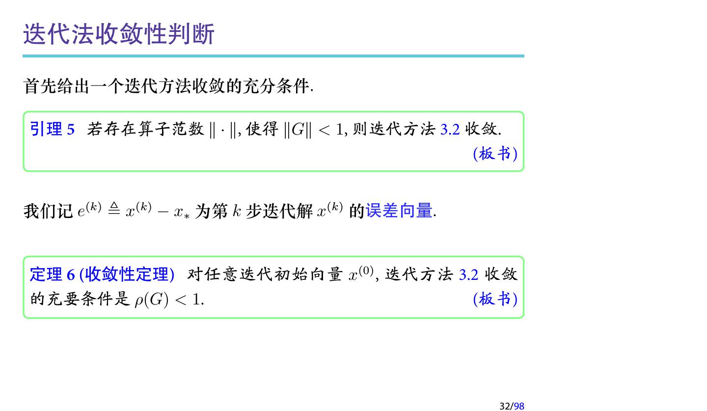 29 .2.1 迭代法的收敛性 定义 2 (迭代法的收敛性) 对于迭代方法 x(k+1) = Gx(k) + g, 如果存在 x∗ , 使得对任意的初始向量 x(0) , 都有 lim x(k) = x∗ , k→∞ 则称迭代格式 (3.2) 是收敛的, 否则就称为发散的. 注记 基于矩阵分裂的迭代方法, 其收敛性取决于迭代矩阵的谱半径. 29/98