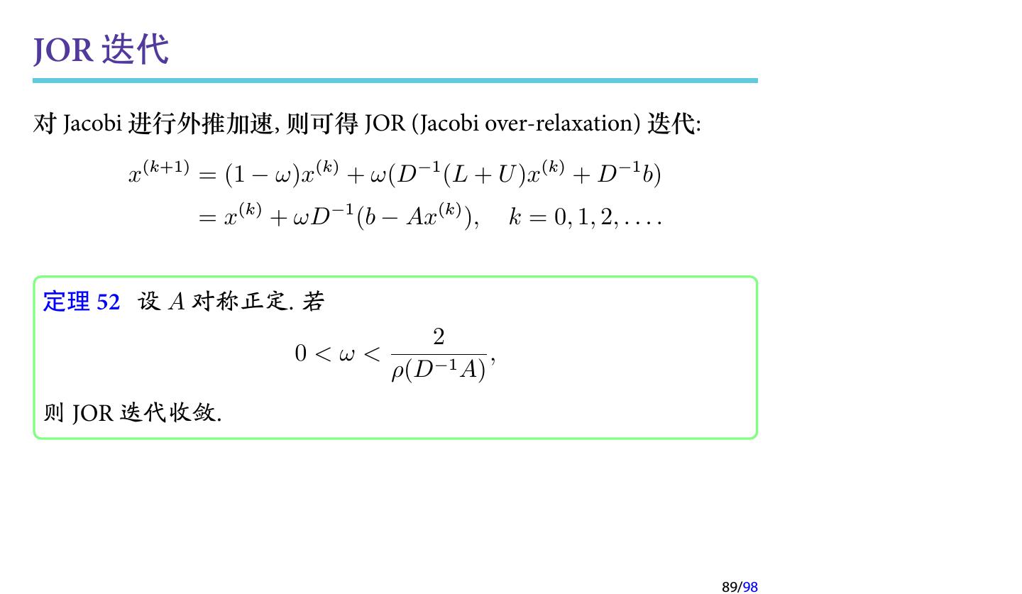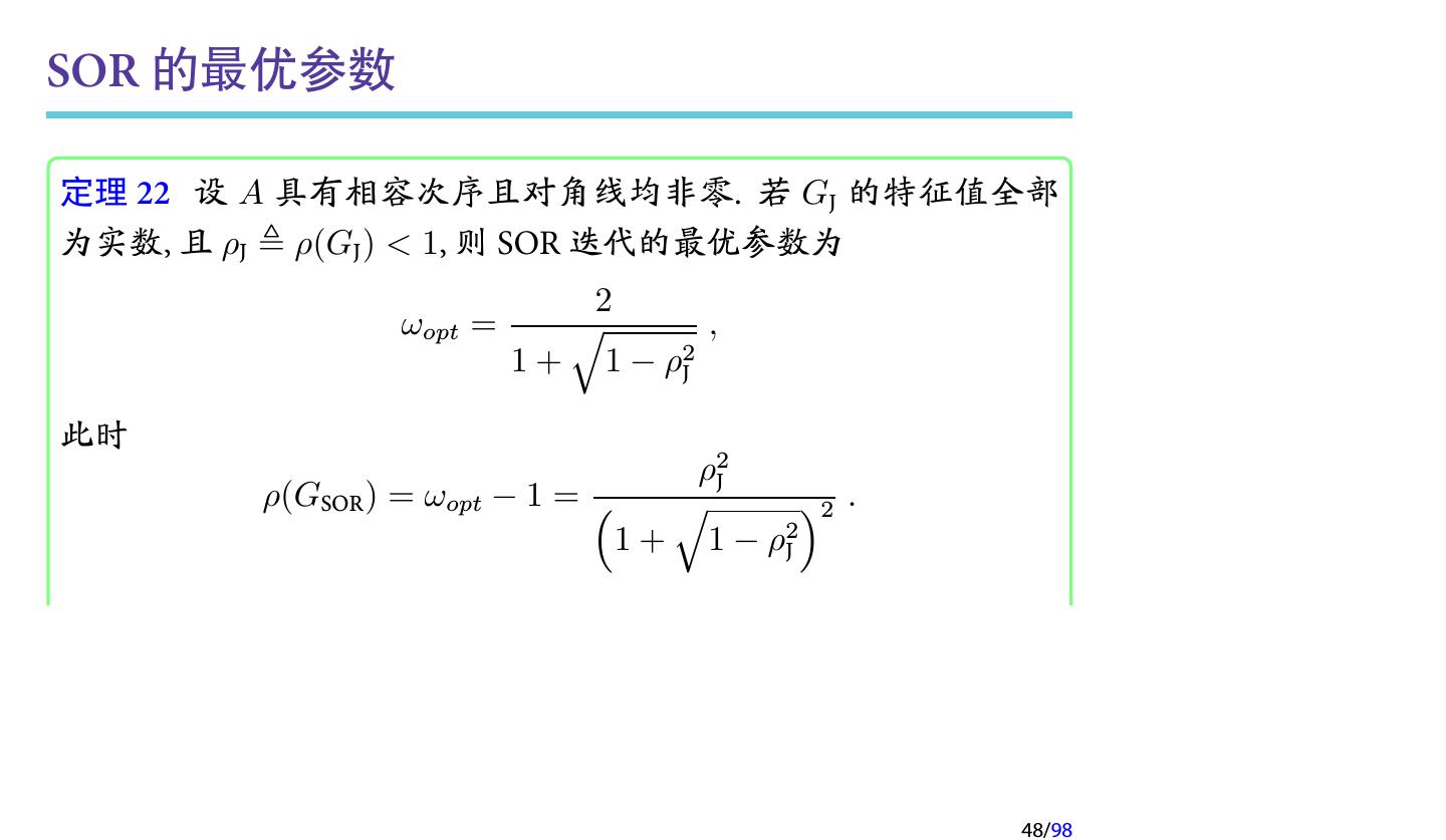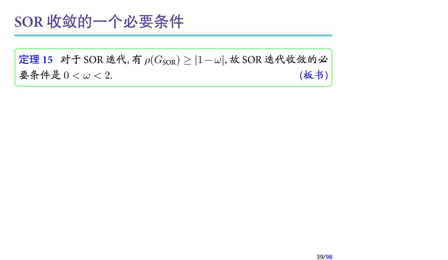 16 .SOR 迭代方法 (cont.) SOR 的迭代矩阵为 ( ) GSOR = (D − ωL)−1 (1 − ω)D + ωU 对应的矩阵分裂为 1 1−ω M= D − L, N= D+U ω ω 16/98