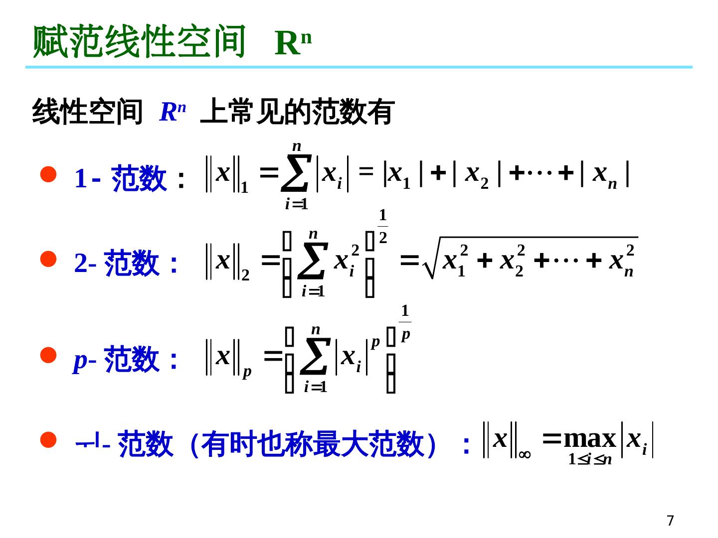 7 .7 赋范线性空间 R n 线性空间 R n 上常见的范数有 1 - 范数 : 2- 范数: - 范数(有时也称最大范数): p - 范数: