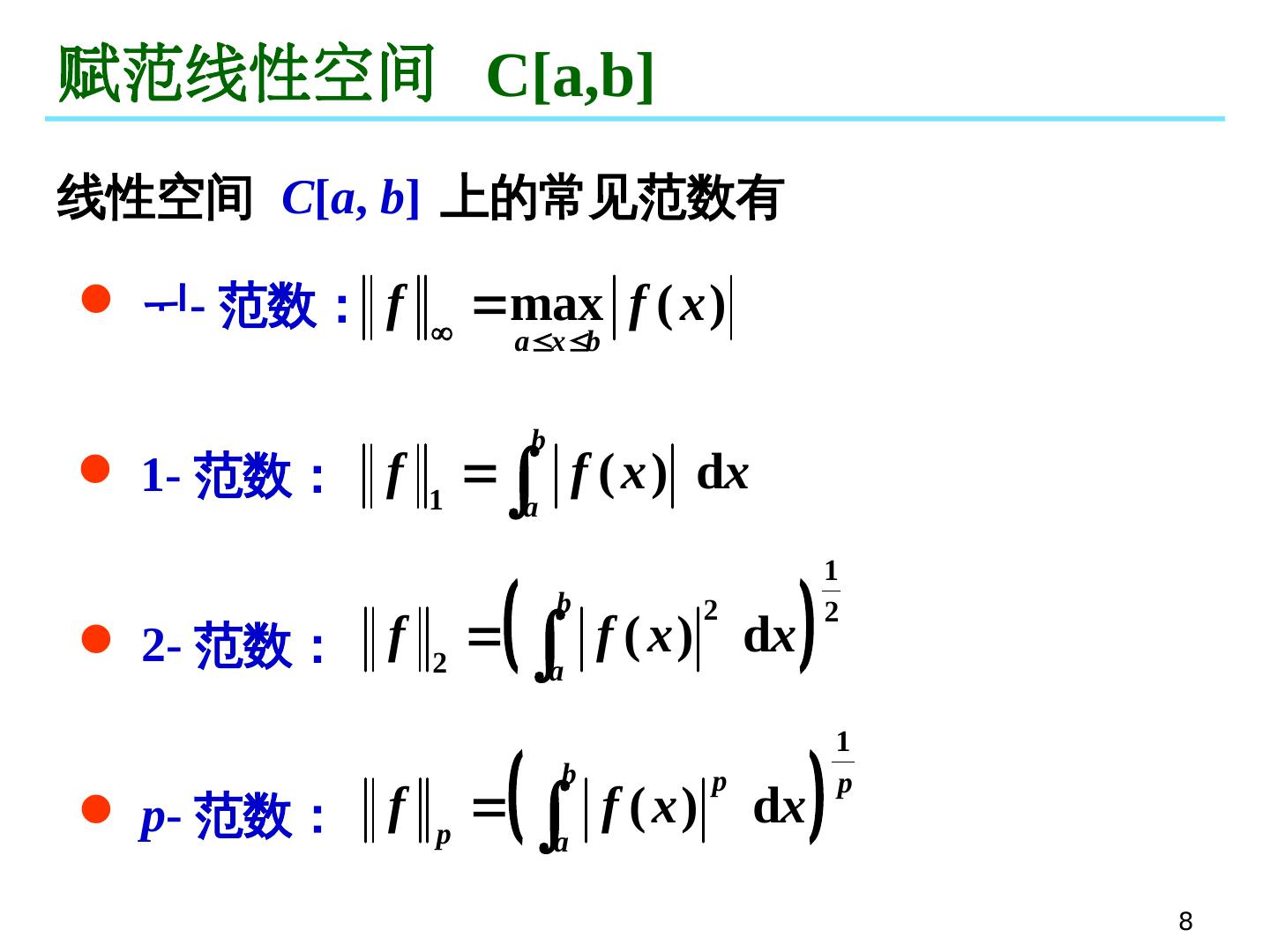 8 .8 赋范线性空间 C[a,b] 线性空间 C [ a , b ] 上 的常见范数有 1- 范数: 2- 范数: - 范数: p - 范数: