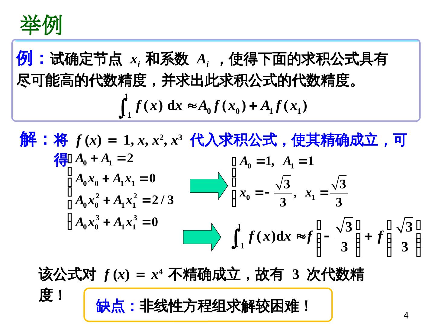 4 .4 举例 例: 试确定节点 x i 和系数 A i , 使得下面的求积公式具有尽可能高的代数精度,并求出此求积公式的代数精度。 解: 将 f ( x )=1, x , x 2 , x 3 代入求积公式,使其精确成立,可得 该公式对 f ( x )= x 4 不精确成立,故有 3 次代数精度! 缺点: 非线性方程组求解较困难!