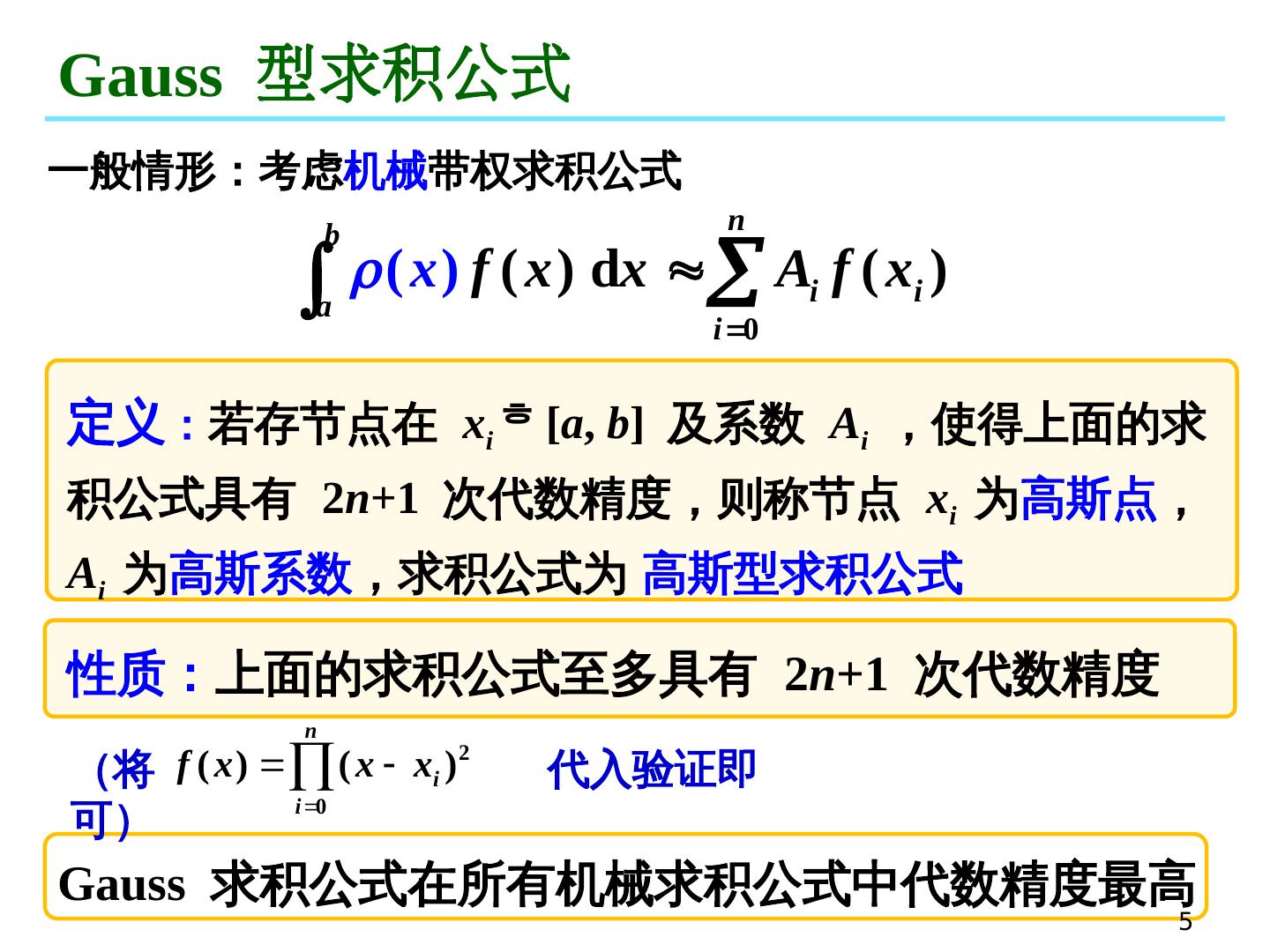 5 .5 Gauss 型求积公式 一般情形:考虑 机械 带权求积公式 定义 : 若存节点在 x i [ a , b ] 及系数 A i ,使得上面的求积公式具有 2 n +1 次代数精度,则称节点 x i 为 高斯点 , A i 为 高斯系数 ,求积公式为 高斯型求积公式 性质: 上面的求积公式至多具有 2 n +1 次代数精度 (将 代入验证即可) Gauss 求积公式在所有机械求积公式中代数精度最高