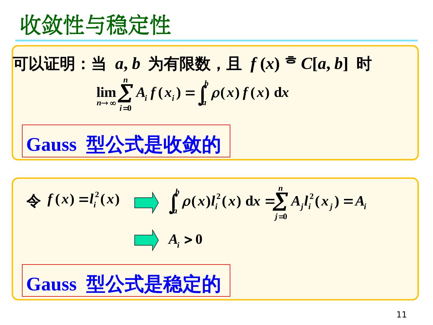 11 .11 收敛性与稳定性 可以证明:当 a , b 为有限数,且 f ( x ) C [ a , b ] 时 Gauss 型公式是收敛的 令 Gauss 型公式是稳定的