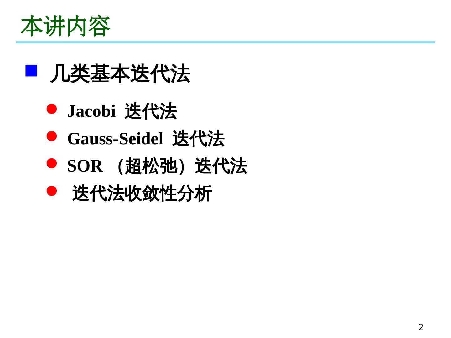 2 .2 本讲内容 Jacobi 迭代法 Gauss-Seidel 迭代法 SOR (超松弛)迭代法 迭代法收敛性分析 几类基本迭代法