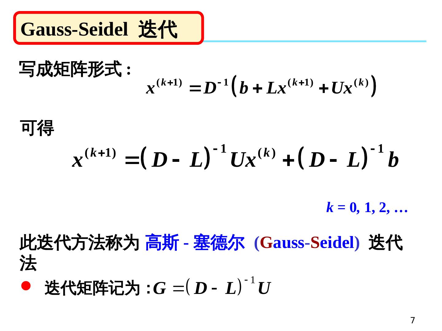 7 .7 Gauss-Seidel 迭代 写成矩阵形式 : 此迭代方法称为 高斯 - 塞德尔 ( G auss - S eidel ) 迭代法 k = 0 , 1, 2, … 可得 迭代矩阵记为: Gauss-Seidel 迭代