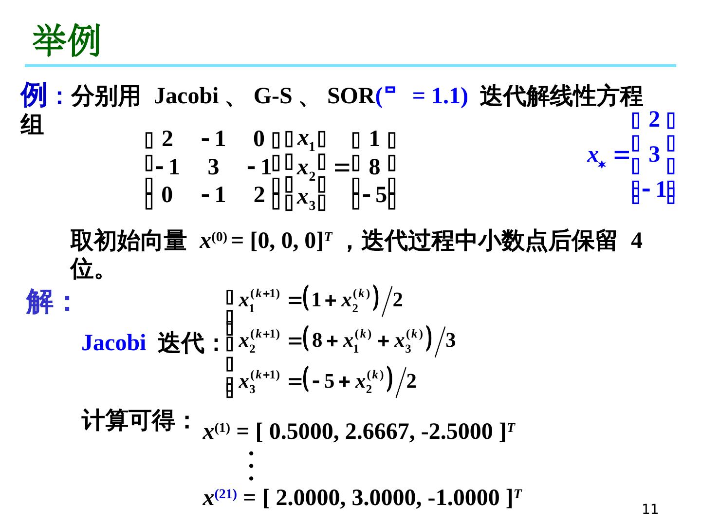 11 .11 举例 例 : 分别用 Jacobi 、 G-S 、 SOR ( = 1.1 ) 迭代解线性方程组 取初始向量 x (0) = [0 , 0, 0] T , 迭代过程中小数点后保留 4 位。 解: Jacobi 迭代: 计算可 得: x (1) = [ 0.5000, 2.6667, -2.5000 ] T x (21) = [ 2.0000, 3.0000, -1.0000 ] T