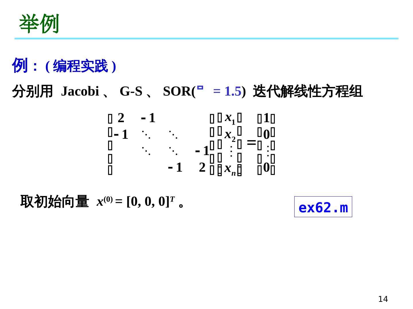 14 .14 举例 例 : ( 编程实践 ) 分别 用 Jacobi 、 G-S 、 SOR( = 1.5 ) 迭代解线性方程组 取初始向量 x (0) = [0 , 0, 0] T 。 ex62.m