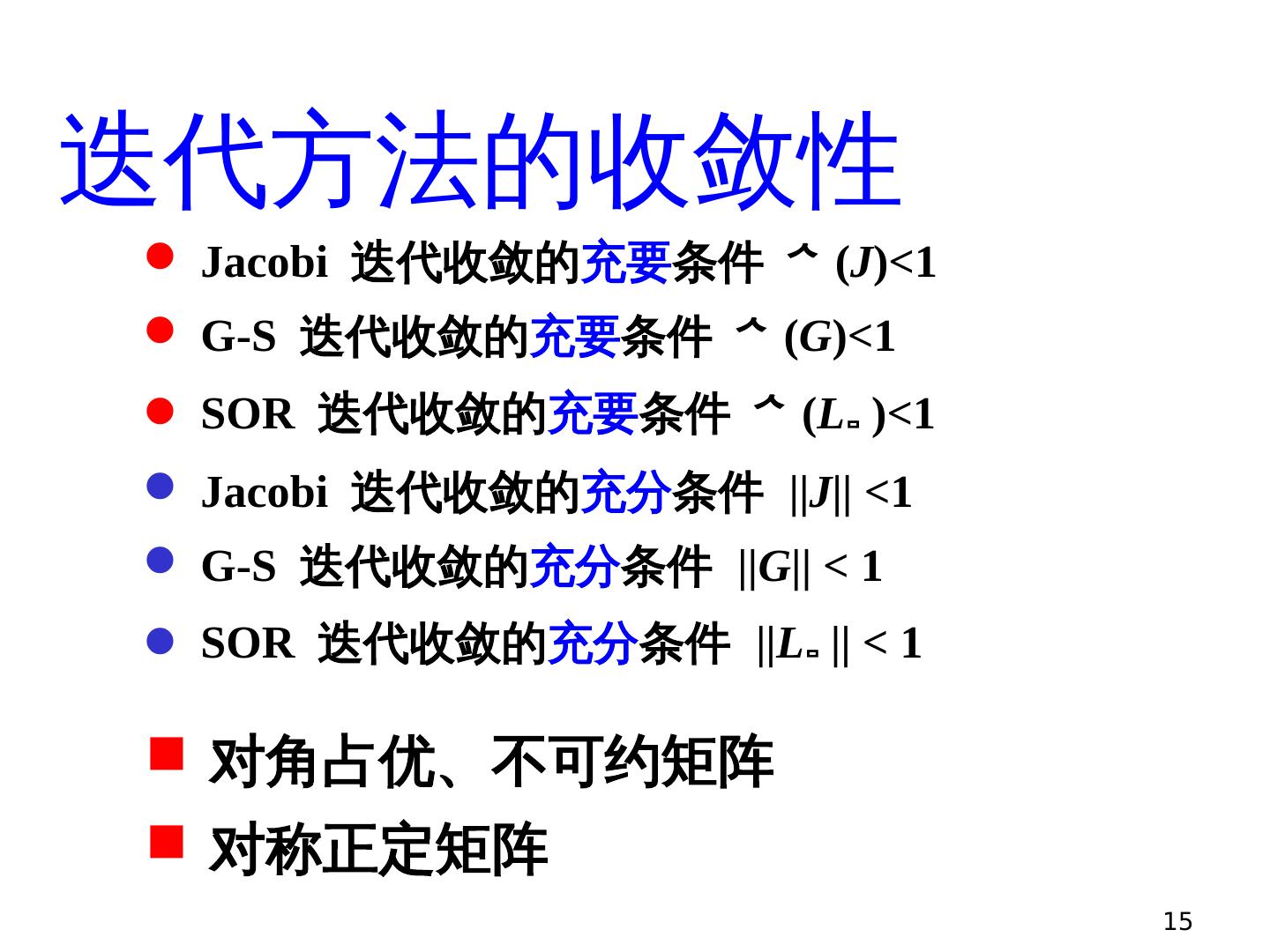 15 .15 迭代方法的收敛性 Jacobi 迭代收敛的 充要 条件 ( J )<1 G-S 迭代收敛的 充要 条件 ( G )<1 SOR 迭代收敛的 充要 条件 ( L )<1 Jacobi 迭代收敛的 充分 条件 || J|| <1 G-S 迭代收敛的 充分 条件 ||G || < 1 SOR 迭代收敛的 充分 条件 || L || < 1 对角占优、不可约矩阵 对称正定矩阵
