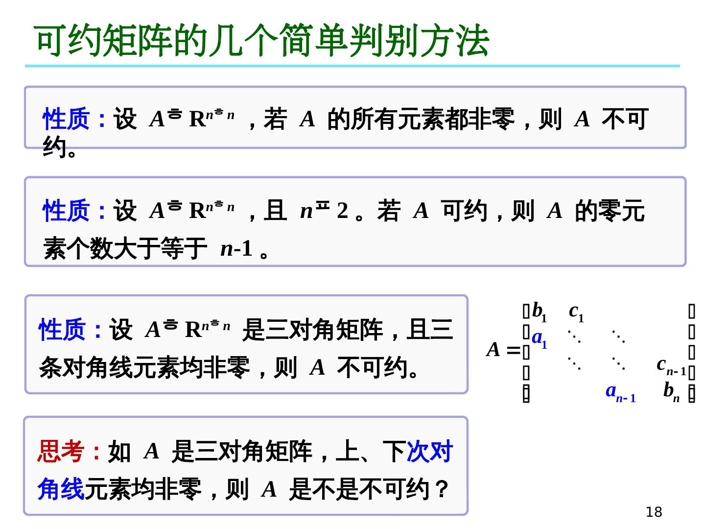 18 .18 可约 矩阵的几个简单判别方法 性质: 设 A R n n , 若 A 的所有元素都非零,则 A 不可约。 性质: 设 A R n n ,且 n 2 。 若 A 可约,则 A 的零元素个数大于等于 n -1 。 性质: 设 A R n n 是 三对角矩阵,且三条对角线元素均非零,则 A 不可约。 思考: 如 A 是 三对角矩阵,上、下 次对角线 元素均非零,则 A 是不是不可约?