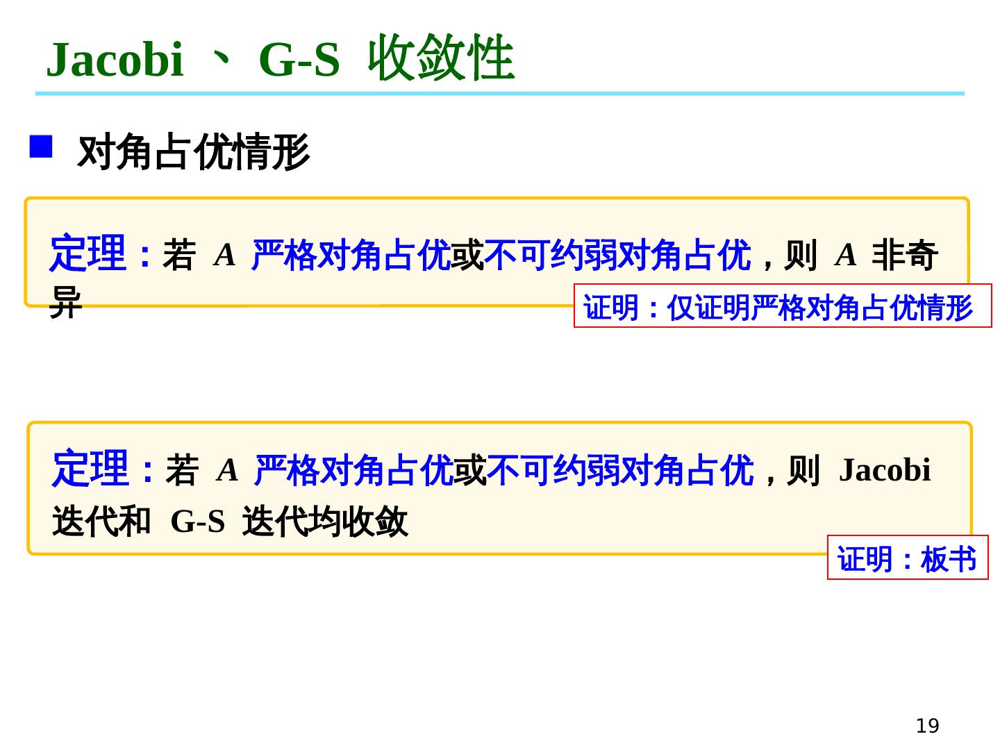 19 .19 Jacobi 、 G-S 收敛性 定理 : 若 A 严格对角占优 或 不可约弱对角占优 ,则 A 非奇异 定理 : 若 A 严格对角占优 或 不可约弱对角占优 ,则 Jacobi 迭代和 G-S 迭代均收敛 证明 :仅证明严格对角占优情形 证明:板书 对角占优情形
