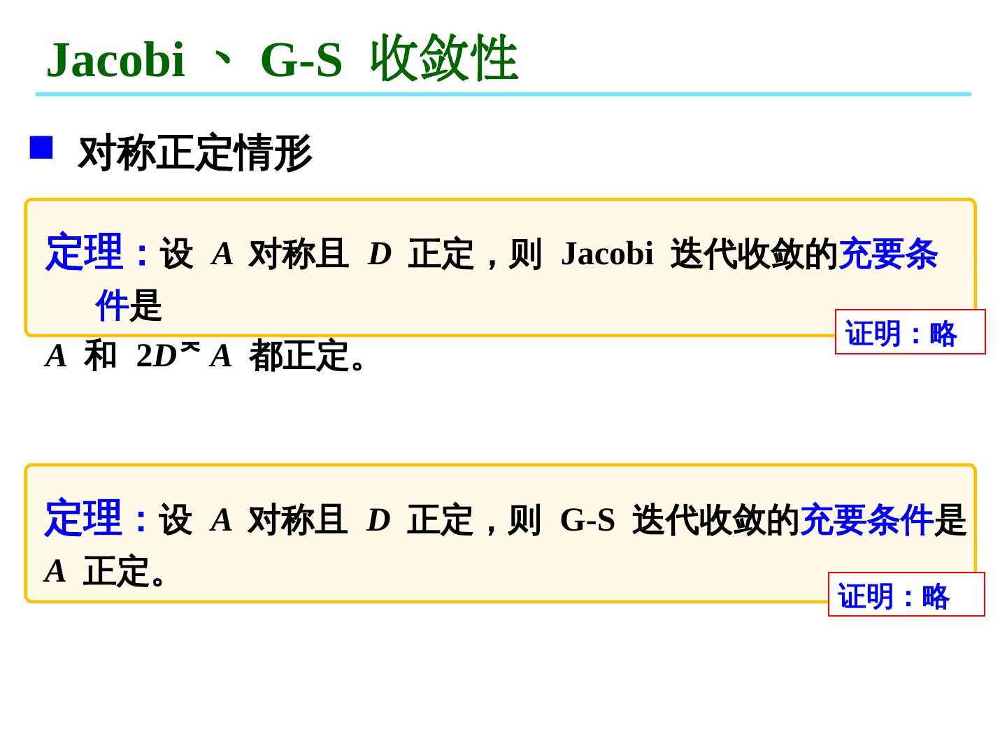 20 .20 Jacobi 、 G-S 收敛性 定理 : 设 A 对称且 D 正定,则 Jacobi 迭代收敛的 充要条件 是 A 和 2 D A 都正定。 证明:略 定理 : 设 A 对称且 D 正定,则 G-S 迭代收敛的 充要条件 是 A 正定。 证明:略 对称正定情形