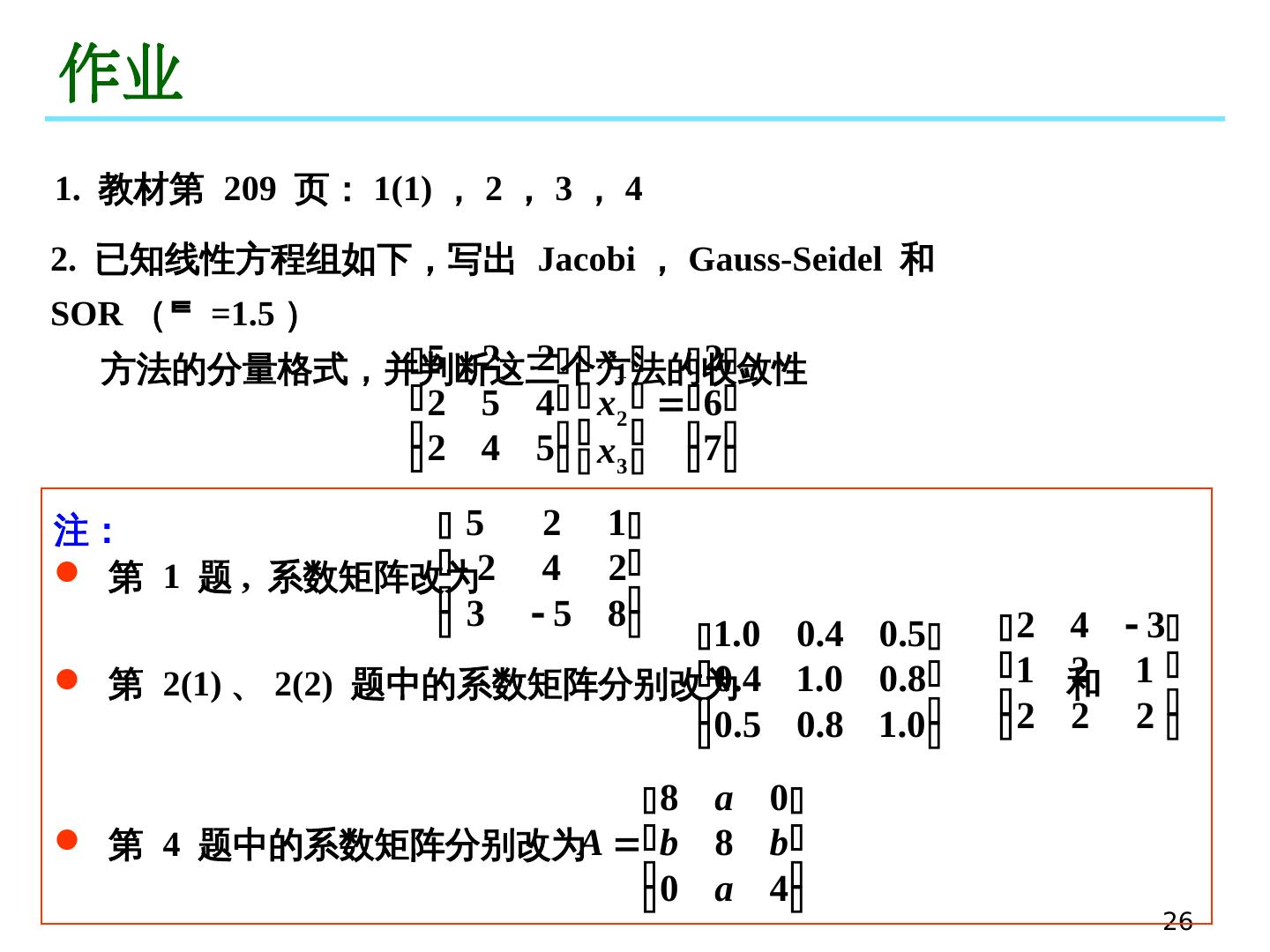 26 .26 作业 1. 教材第 209 页: 1(1) , 2 , 3 , 4 2. 已知线性方程组如下,写出 Jacobi , Gauss-Seidel 和 SOR ( =1.5 ) 方法的分量格式,并判断这三个 方法 的收敛性 注: 第 1 题 , 系数矩阵改为 第 2(1) 、 2(2) 题中 的 系数矩阵分别改为 和 第 4 题中 的系数矩阵分别改为
