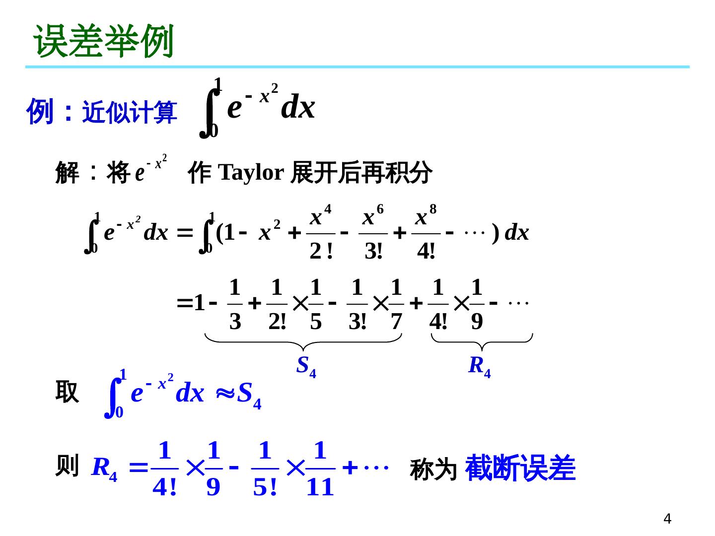 4 .4 误差举例 例: 近似计算 解 : 将 作 Taylor 展开后再积分 S 4 R 4 取 则 称为 截断误差