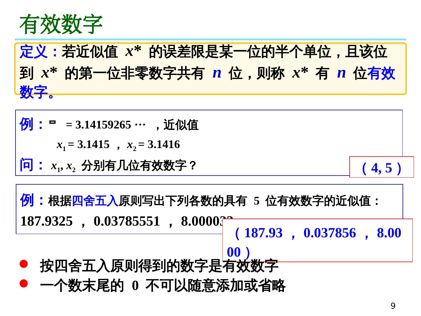 9 .9 有效数字 例: = 3.14159265 ··· ,近似值 x 1 = 3.1415 , x 2 = 3.1416 问: x 1 , x 2 分别有几位有效数字? 例: 根据 四舍五入 原则 写出下列各数的具有 5 位有效数字的近似值: 187.9325 , 0.03785551 , 8.000033 ( 187.93 , 0.037856 , 8.0000 ) ( 4, 5 ) 按四舍五入原则得到的数字是有效数字 一个数末尾的 0 不可以随意添加或省略 定义: 若近似值 x * 的误差限是某一位的半个单位,且该位到 x * 的第一位非零数字共有 n 位,则称 x * 有 n 位 有效数字。