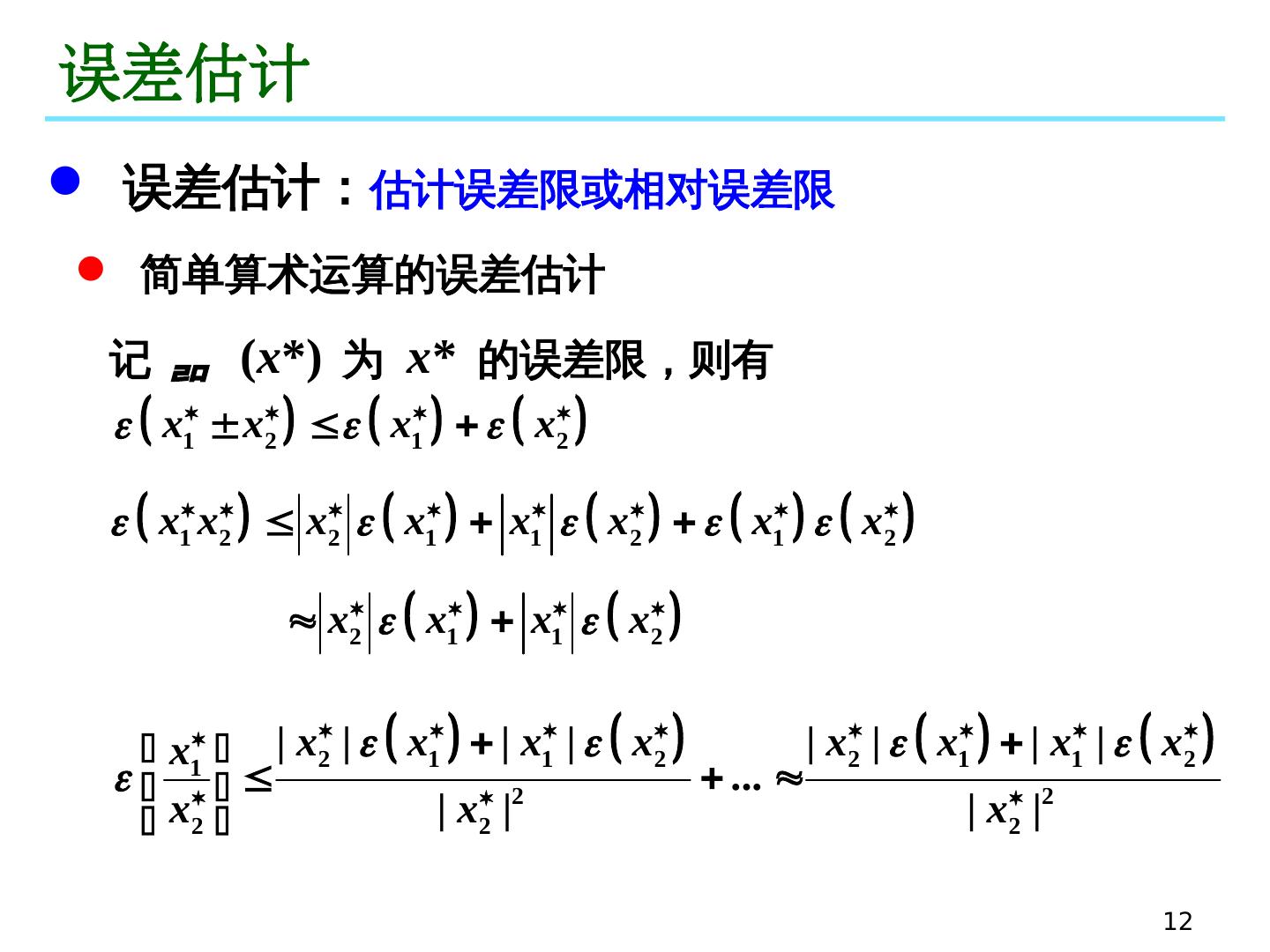 12 .12 误差估计 误差估计: 估计误差限或相对误差限 记 ( x *) 为 x * 的误差限,则有 简单算术运算的误差估计