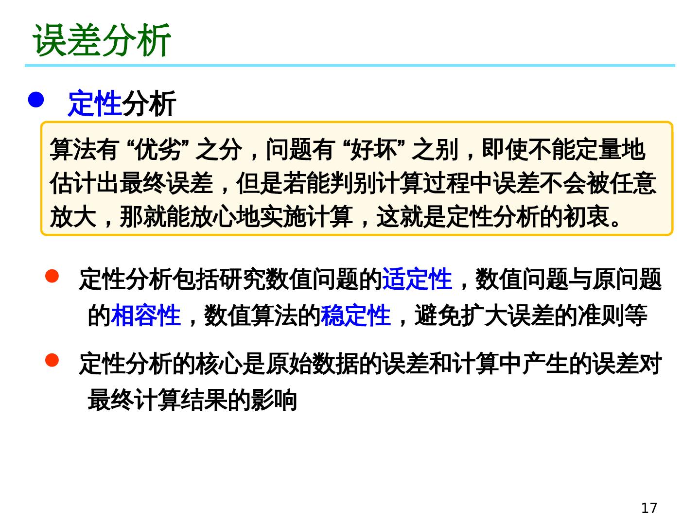 17 .17 误差分析 定性 分析 定性分析包括研究数值问题的 适定性 ,数值问题与原 问题 的 相容性 ,数值算法的 稳定性 ,避免扩大误差的准则等 定性分析的核心是原始数据的误差和计算中产生的误差 对 最终 计算结果的影响 算法有 “优劣” 之分,问题有 “好坏” 之别,即使不能定量地估计出最终误差,但是若能判别计算过程中误差不会被任意放大,那就能放心地实施计算,这就是定性分析的初衷。