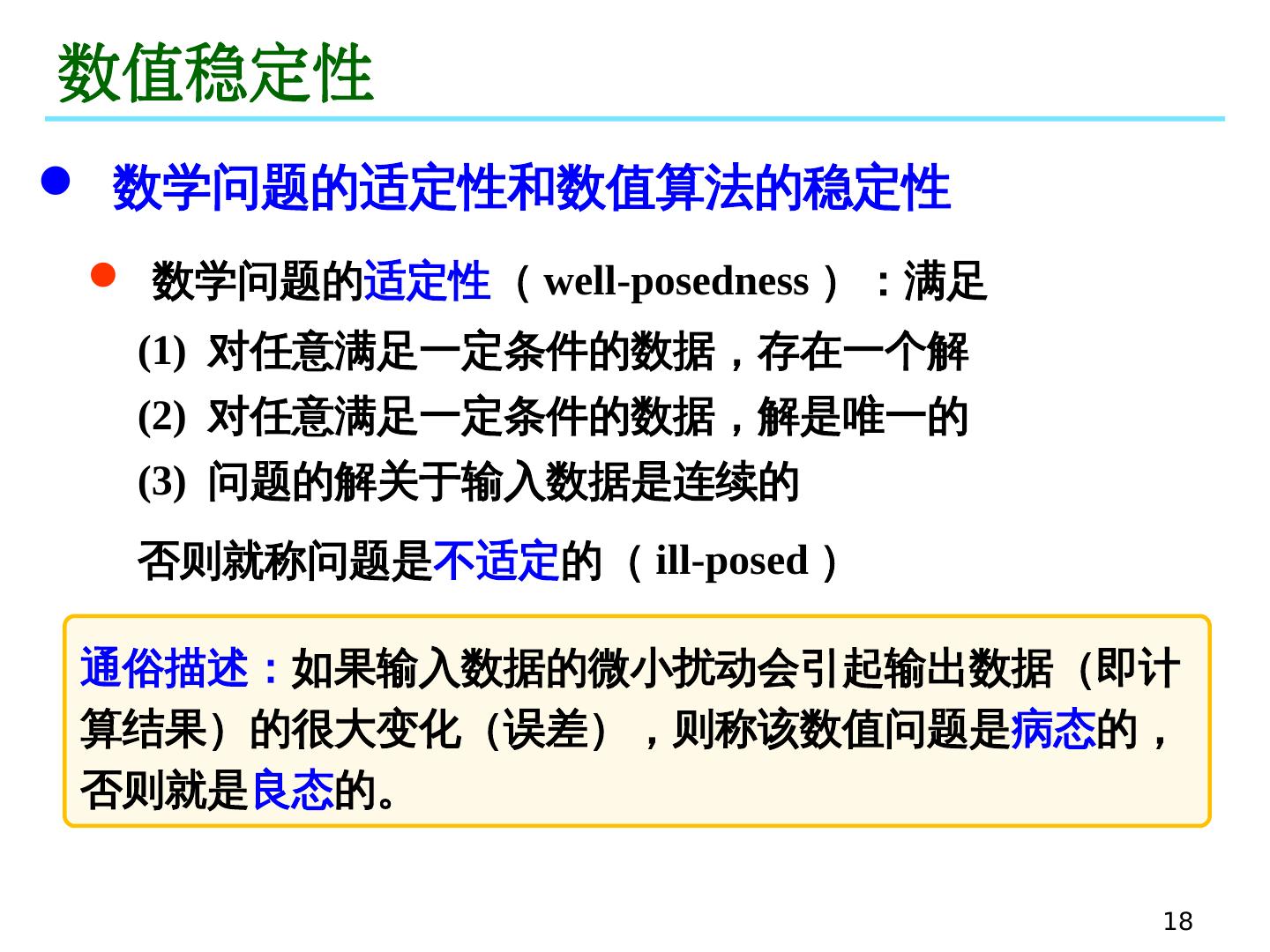 18 .18 数值稳定性 数学 问题 的适定性 和数值算法的稳定性 数学问题 的 适定性 ( well- posedness ):满足 (1) 对任意满足一定条件的数据,存在一个解 (2) 对任意满足一定条件的数据,解是唯一的 (3) 问题的解关于输入数据是连续的 否则就称问题是 不适定 的( ill-posed ) 通俗描述: 如果输入数据的微小扰动会引起输出数据(即计算结果)的很大变化(误差),则称该数值问题是 病态 的,否则就是 良态 的。