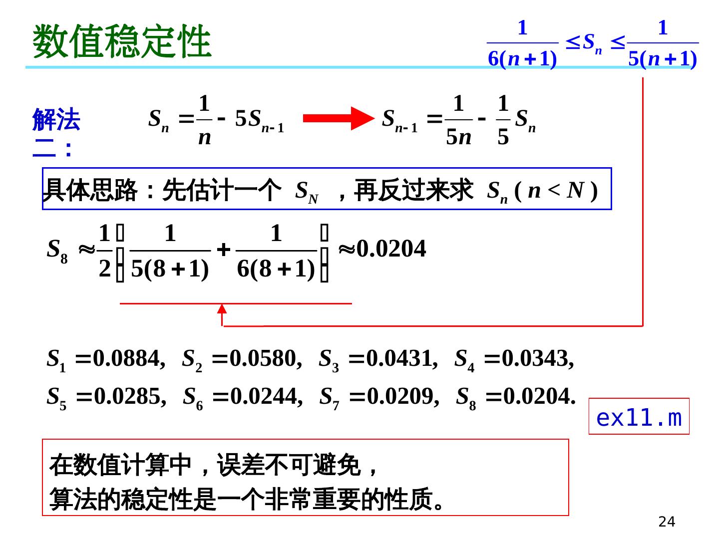 24 .24 数值稳定性 解法二: 具体思路:先估计一个 S N ,再反过来求 S n ( n < N ) 在数值计算中,误差不可避免, 算法的稳定性是一个非常重要的性质。 ex11.m