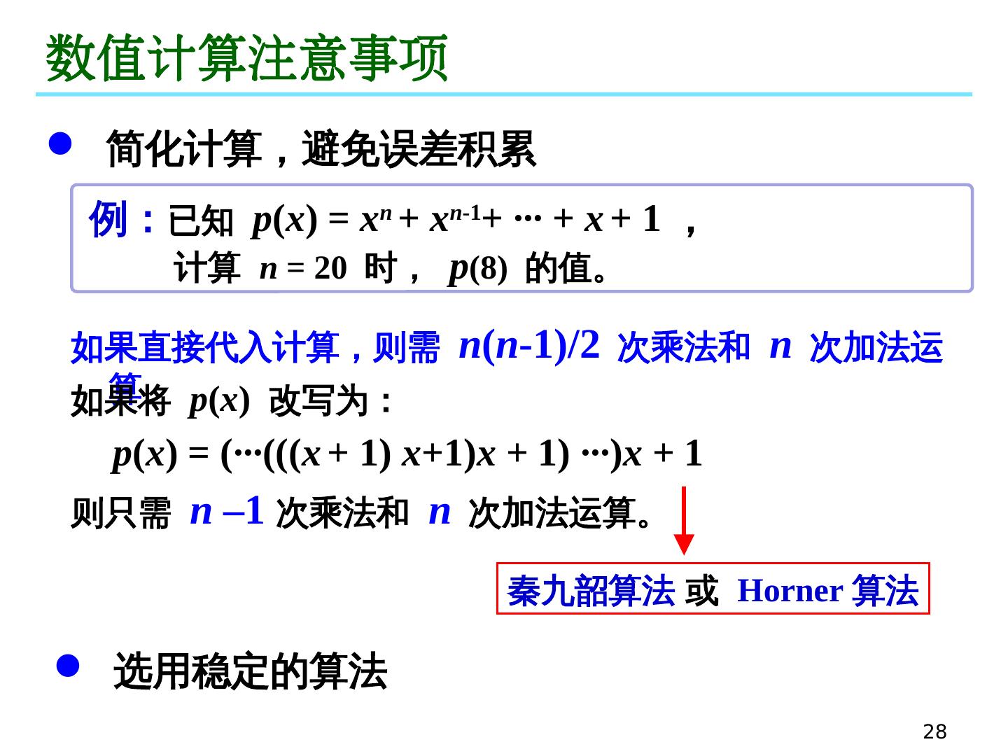 28 .28 数值计算注意事项 简化计算,避免误差积累 选用稳定的算法 例: 已知 p ( x ) = x n + x n -1 + ··· + x + 1 , 计算 n = 20 时, p (8) 的值。 如果直接代入计算,则需 n ( n -1)/2 次乘法和 n 次加法运算 如果将 p ( x ) 改写为: p ( x ) = ( ··· ((( x + 1 ) x +1) x + 1 ) ··· ) x + 1 则只需 n –1 次乘法和 n 次加法运算。 秦九韶算法 或 Horner 算法