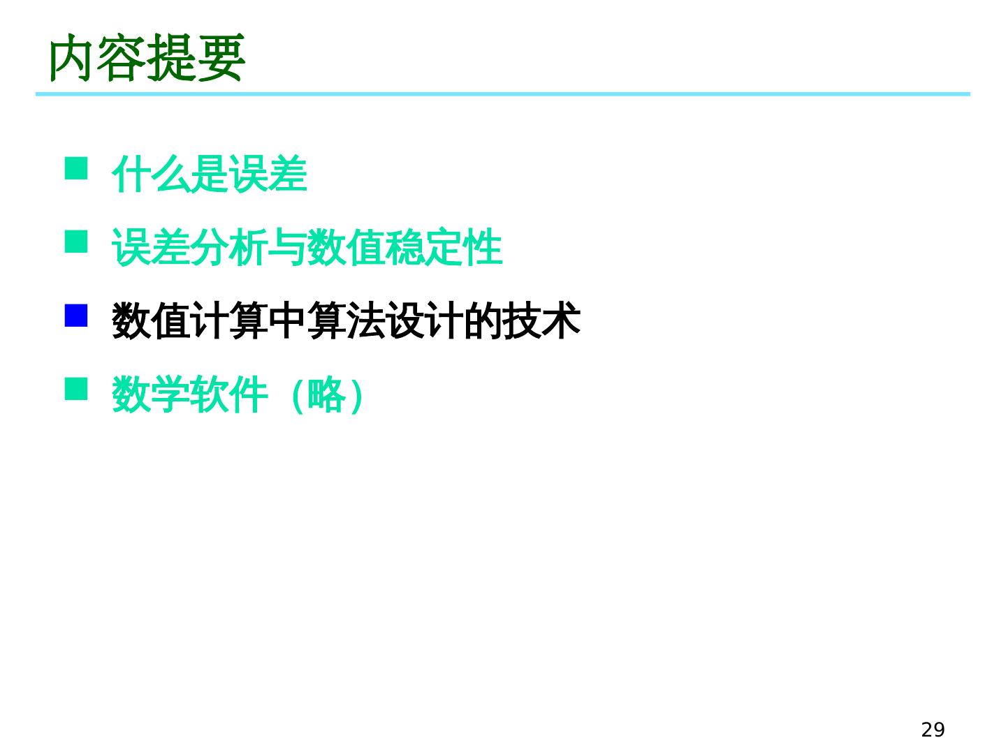 29 .29 内容提要 什么是误差 误差分析与 数值稳定性 数值计算中算法设计的 技术 数学软件(略)