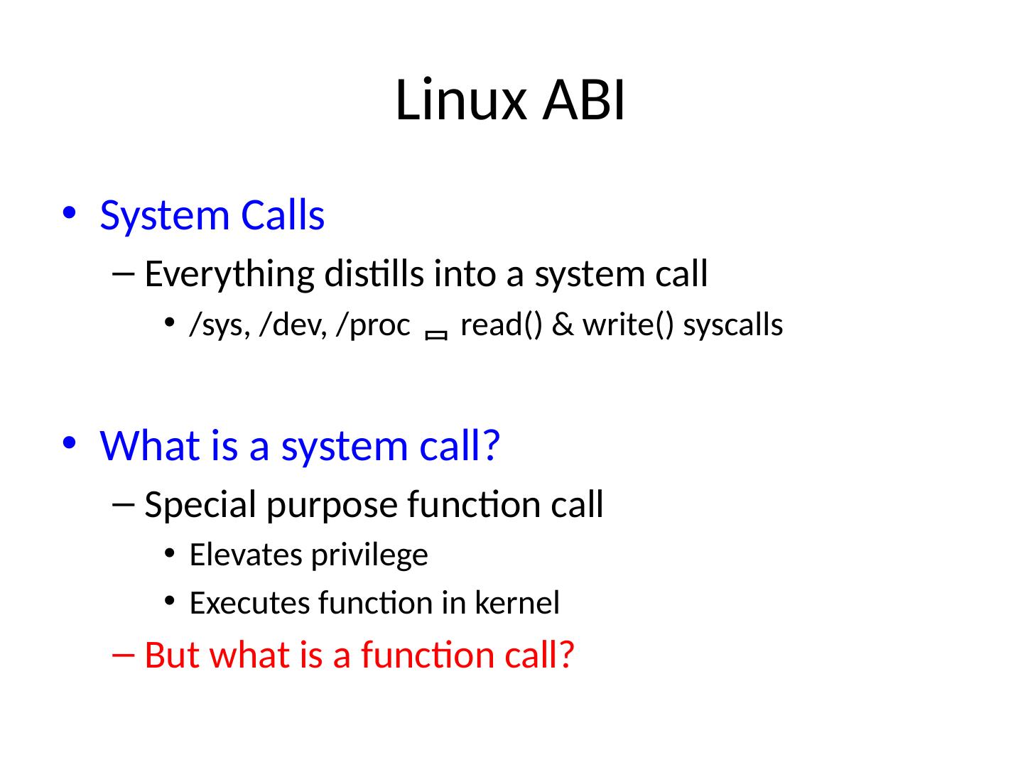 2 .Linux ABI System Calls Everything distills into a system call /sys, / dev , / proc read() & write() syscalls What is a system call? Special purpose function call Elevates privilege Executes function in kernel But what is a function call?