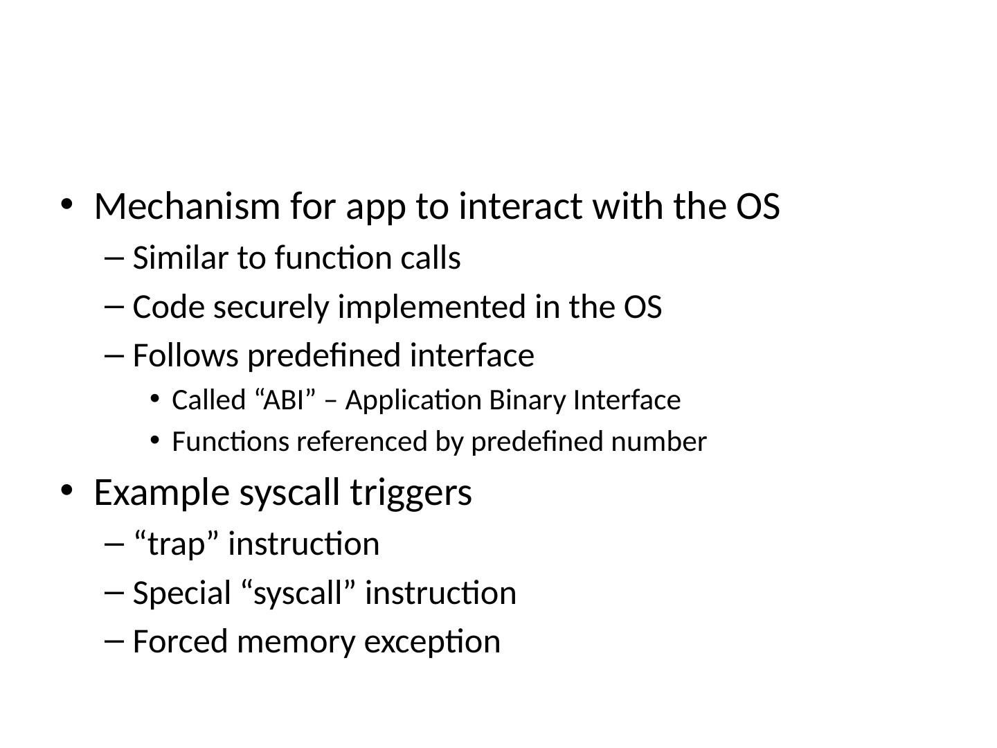 3 .Mechanism for app to interact with the OS Similar to function calls Code securely implemented in the OS Follows predefined interface Called “ABI” – Application Binary Interface Functions referenced by predefined number Example syscall triggers “ trap” instruction Special “ syscall ” instruction Forced memory exception