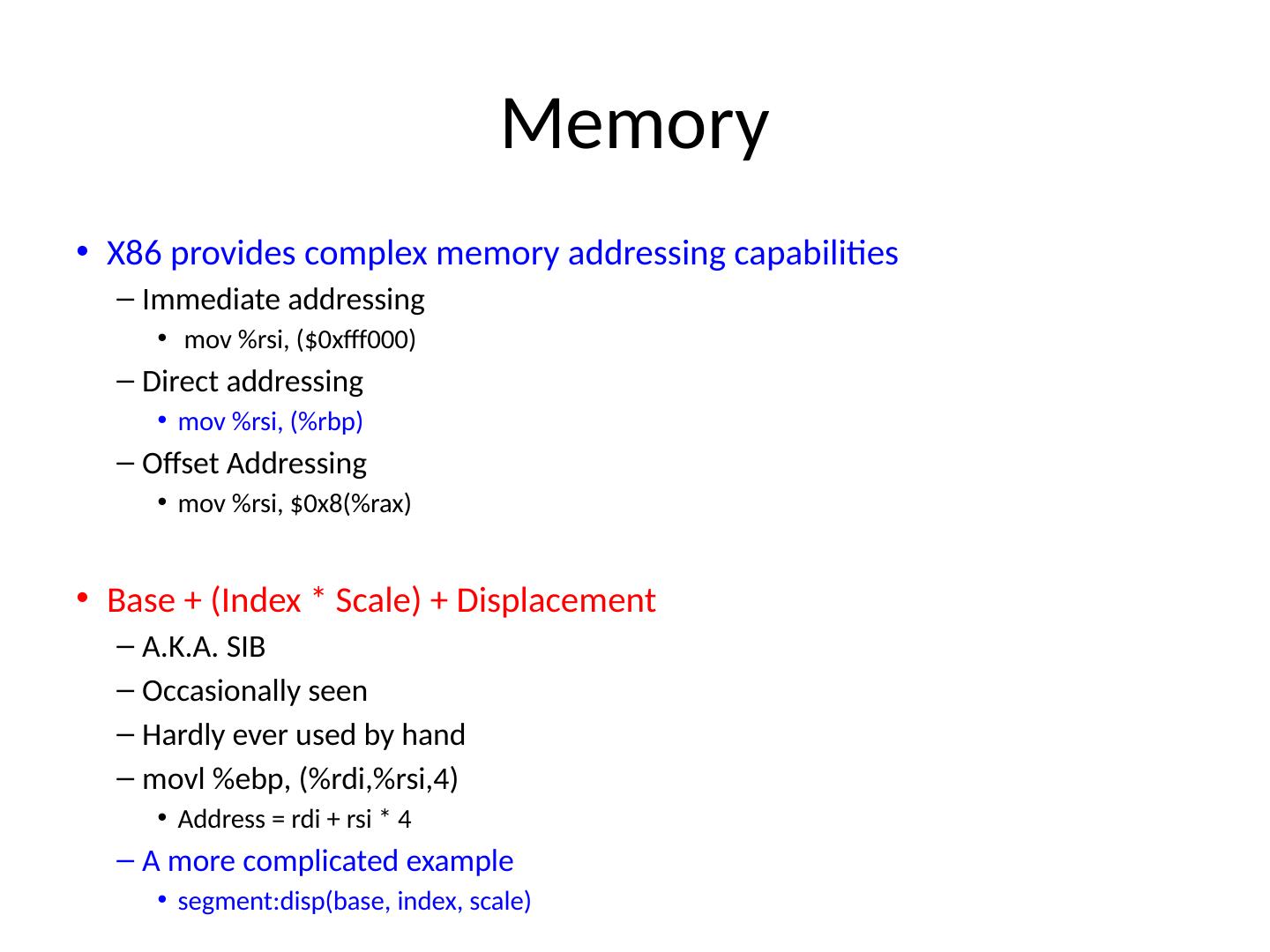9 .Memory X86 provides complex memory addressing capabilities Immediate addressing mov % rsi , ($0xfff000) Direct addressing mov % rsi , (% rbp ) Offset Addressing m ov % rsi , $0x8(% rax ) Base + (Index * Scale) + Displacement A.K.A. SIB Occasionally seen Hardly ever used by hand m ovl % ebp , (%rdi,%rsi,4) Address = rdi + rsi * 4 A more complicated example segment:disp (base, index, scale)