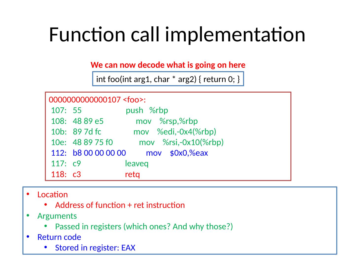 11 .Function call implementation 0000000000000107 <foo>: 107: 55 push % rbp 108: 48 89 e5 mov % rsp ,% rbp 10b: 89 7d fc mov %edi,-0x4(% rbp ) 10e: 48 89 75 f0 mov %rsi,-0x10(% rbp ) 112: b8 00 00 00 00 mov $0x0,%eax 117: c9 leaveq 118: c3 retq Location Address of function + ret instruction Arguments Passed in registers (which ones? And why those?) Return code Stored in register: EAX We can now decode what is going on here i nt foo( int arg1, char * arg2) { return 0; }