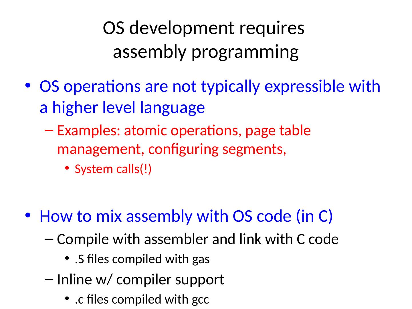 12 .OS development requires assembly programming OS operations are not typically expressible with a higher level language Examples: atomic operations, page table management, configuring segments, System calls(!) How to mix assembly with OS code (in C) Compile with assembler and link with C code .S files compiled with gas Inline w/ compiler support .c files compiled with gcc