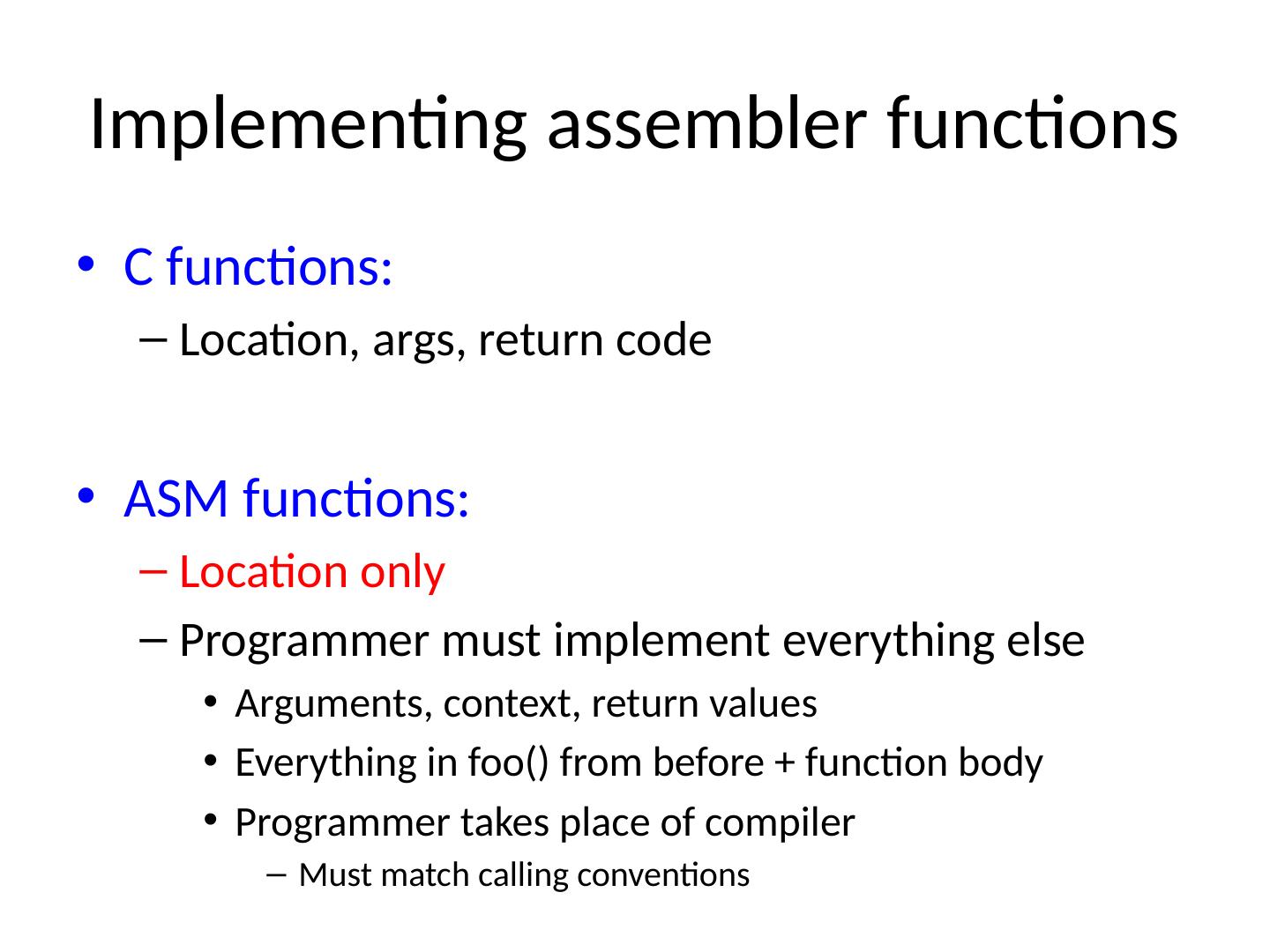 13 .Implementing a ssembler functions C functions: Location, args , return code ASM functions: Location only Programmer must implement everything else Arguments, context, return values Everything in foo() from before + function body Programmer takes place of compiler Must match calling conventions