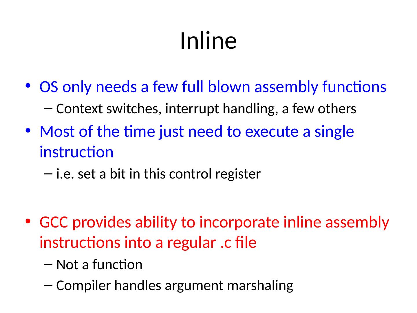 15 .Inline OS only needs a few full blown assembly functions Context switches, interrupt handling, a few others Most of the time just need to execute a single instruction i.e. set a bit in this control register GCC provides ability to incorporate inline assembly instructions into a regular .c file Not a function Compiler handles argument marshaling