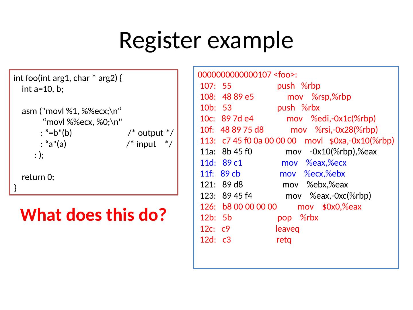 20 .Register example i nt foo( int arg1, char * arg2) { int a=10, b ; asm (" movl %1, %% ecx ;