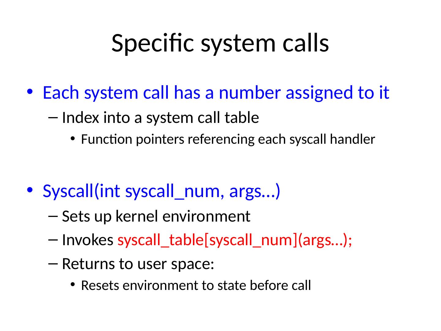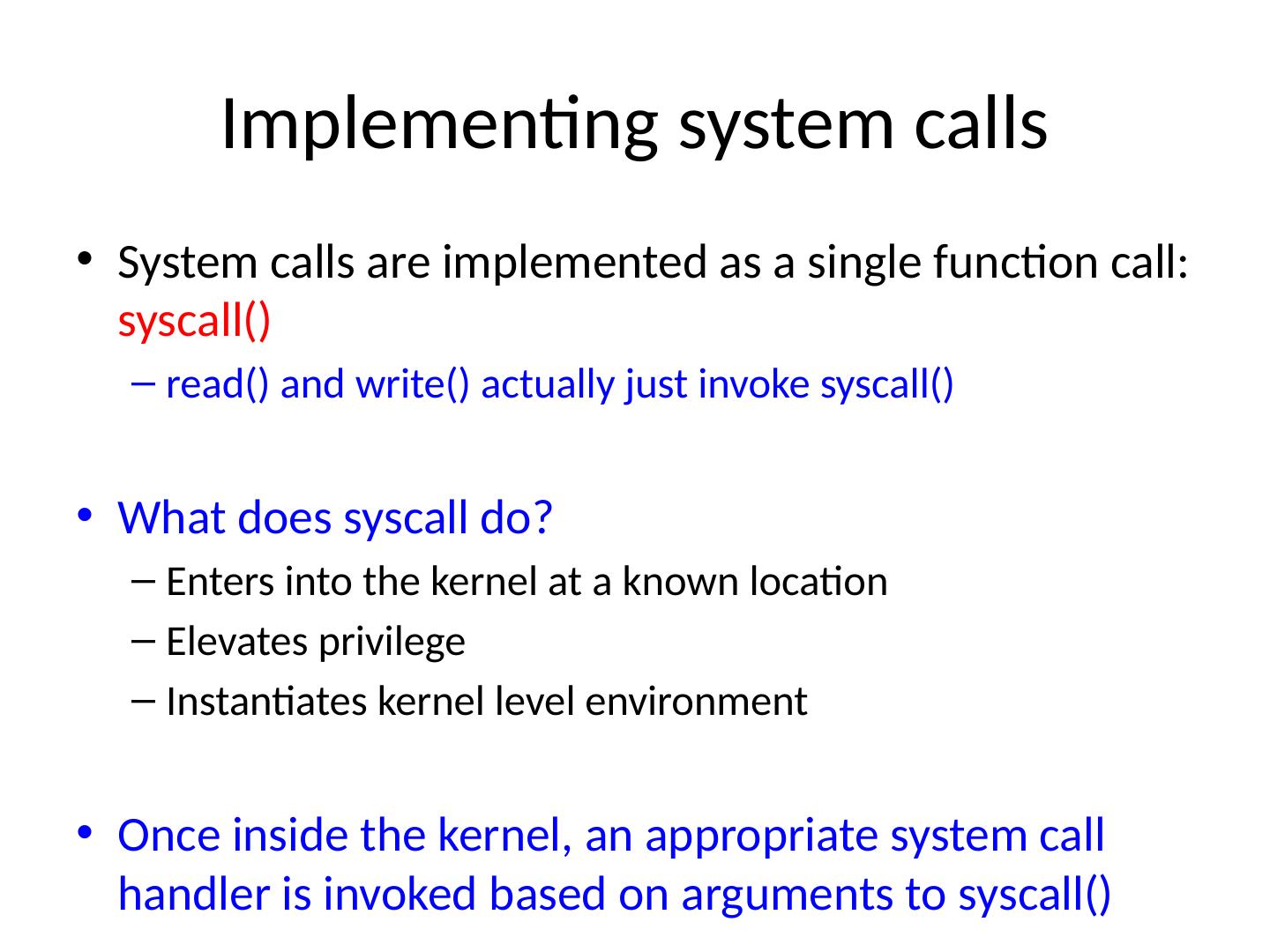 28 .Implementing system calls System calls are implemented as a single function call: syscall () r ead() and write() actually just invoke syscall () What does syscall do? Enters into the kernel at a known location Elevates privilege Instantiates kernel level environment Once inside the kernel, an appropriate system call handler is invoked based on arguments to syscall ()