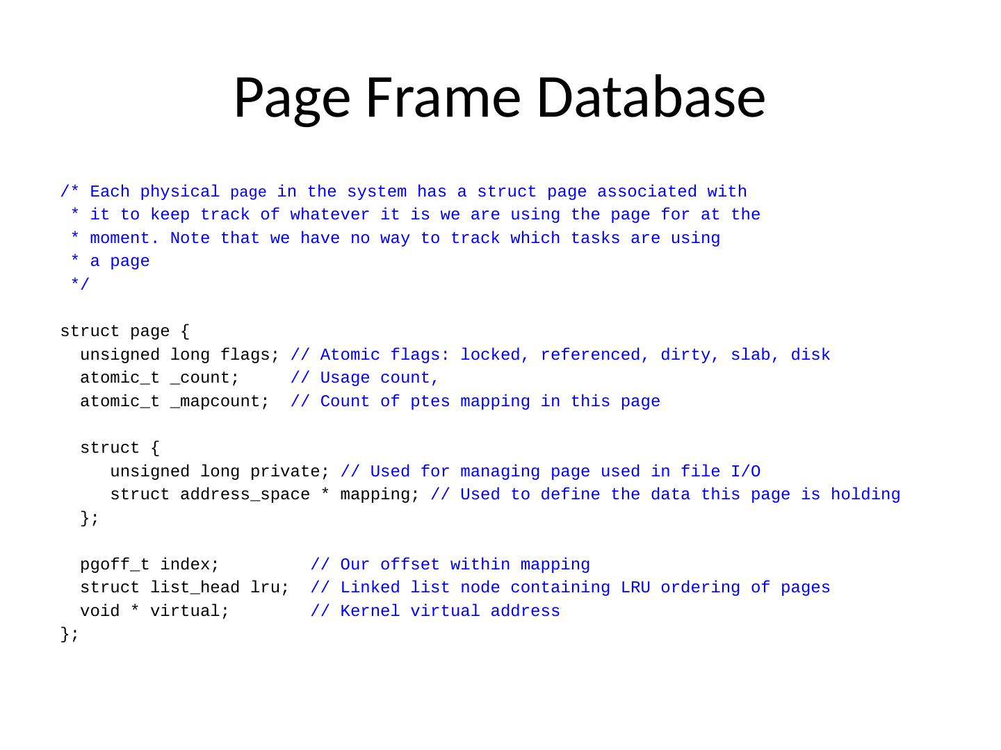 7 .Page Frame Database /* Each physical page in the system has a struct page associated with * it to keep track of whatever it is we are using the page for at the * moment. Note that we have no way to track which tasks are using * a page */ struct page { unsigned long flags; // Atomic flags: locked, referenced, dirty, slab, disk atomic_t _count; // Usage count, atomic_t _ mapcount ; // Count of ptes mapping in this page struct { unsigned long private; // Used for managing page used in file I/O struct address_space * mapping; // Used to define the data this page is holding }; pgoff_t index; // Our offset within mapping struct list_head lru ; // Linked list node containing LRU ordering of pages void * virtual; // Kernel virtual address };