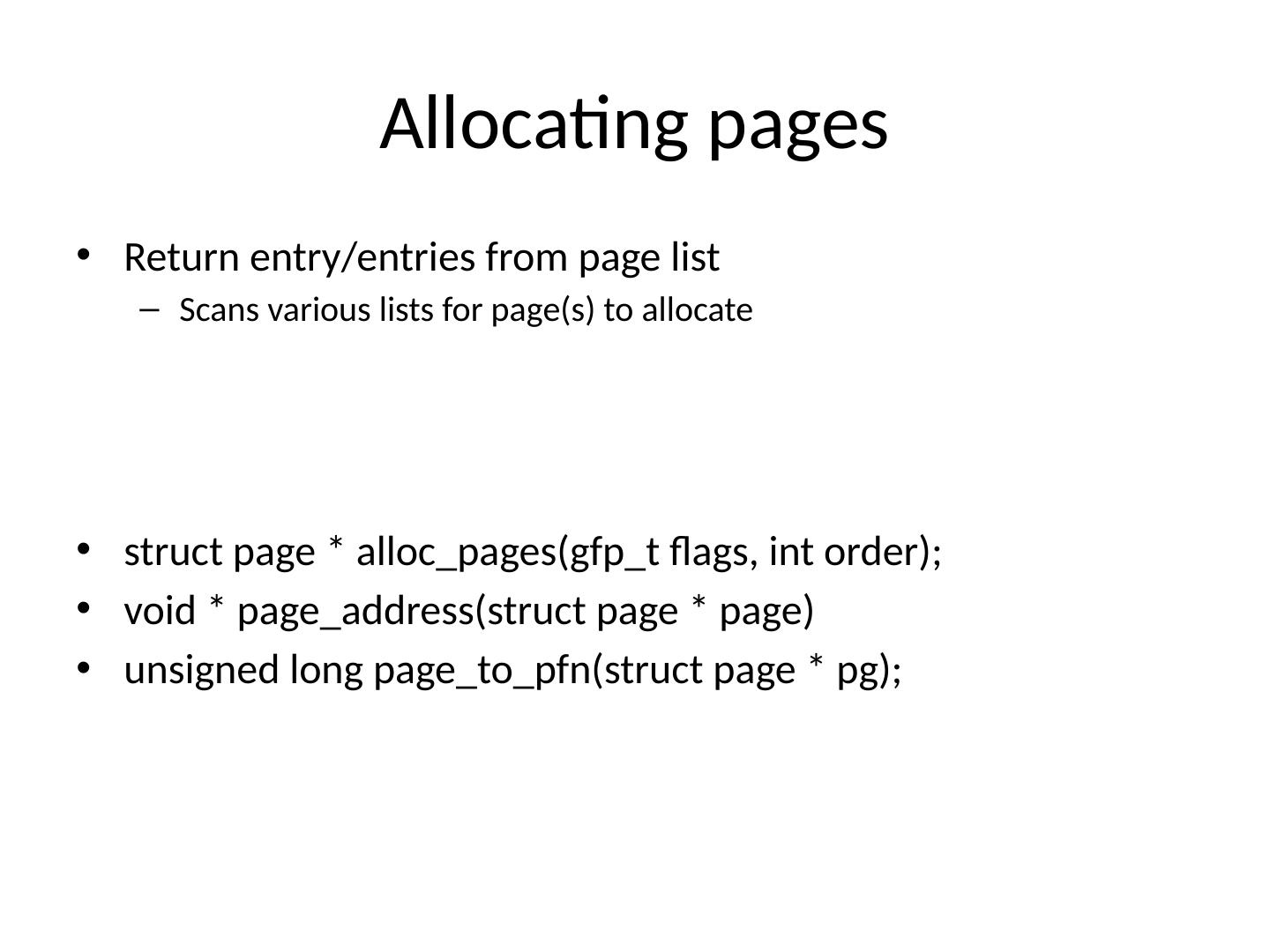 10 .Allocating pages Return entry/entries from page list Scans various lists for page(s) to allocate struct page * alloc_pages ( gfp_t flags, int order); void * page_address ( struct page * page) u nsigned long page_to_pfn ( struct page * pg );