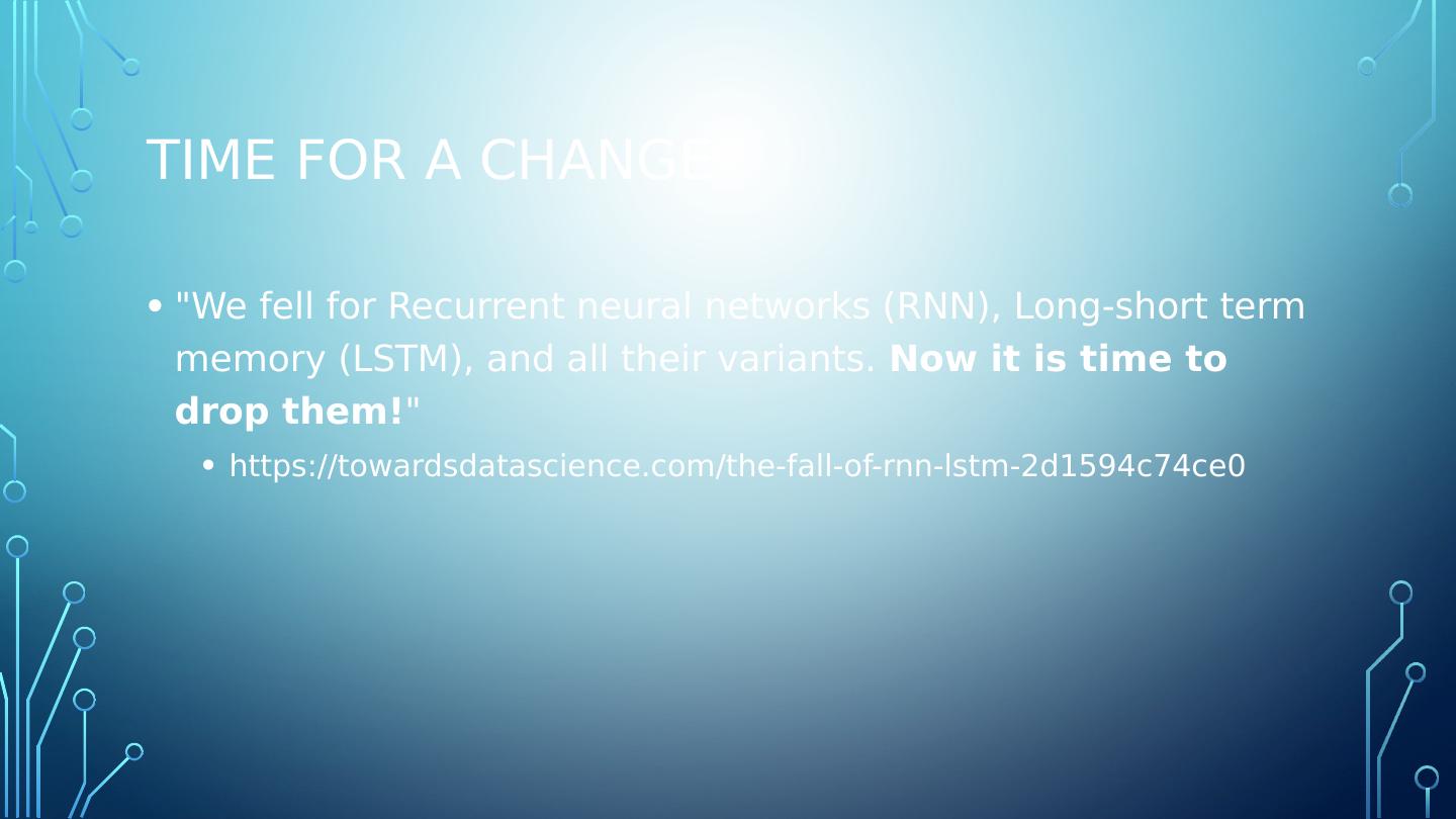 2 .Time for a change "We fell for Recurrent neural networks (RNN), Long-short term memory (LSTM), and all their variants. Now it is time to drop them! " https://towardsdatascience.com/the-fall-of-rnn-lstm-2d1594c74ce0