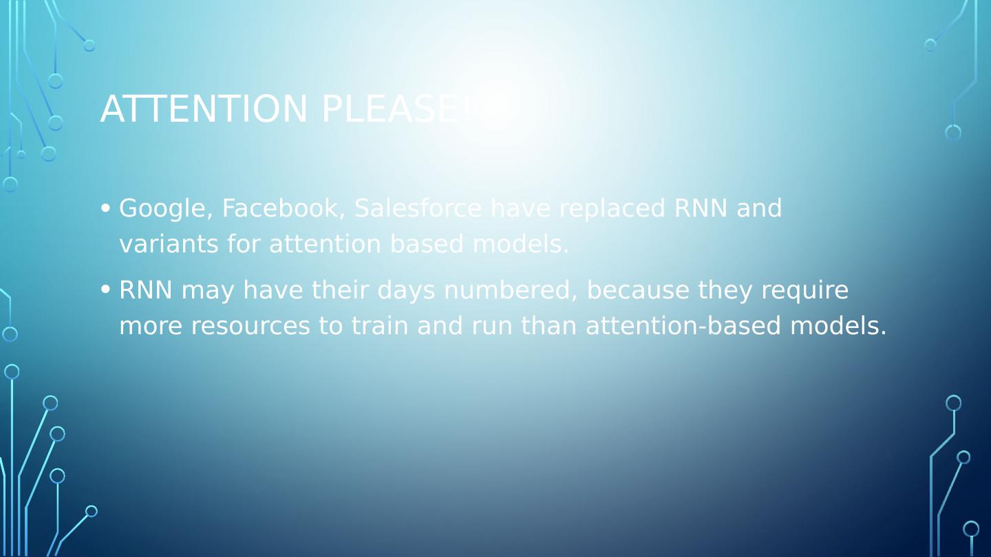 3 .Attention please! Google, Facebook, Salesforce have replaced RNN and variants for attention based models. RNN may have their days numbered, because they require more resources to train and run than attention-based models.