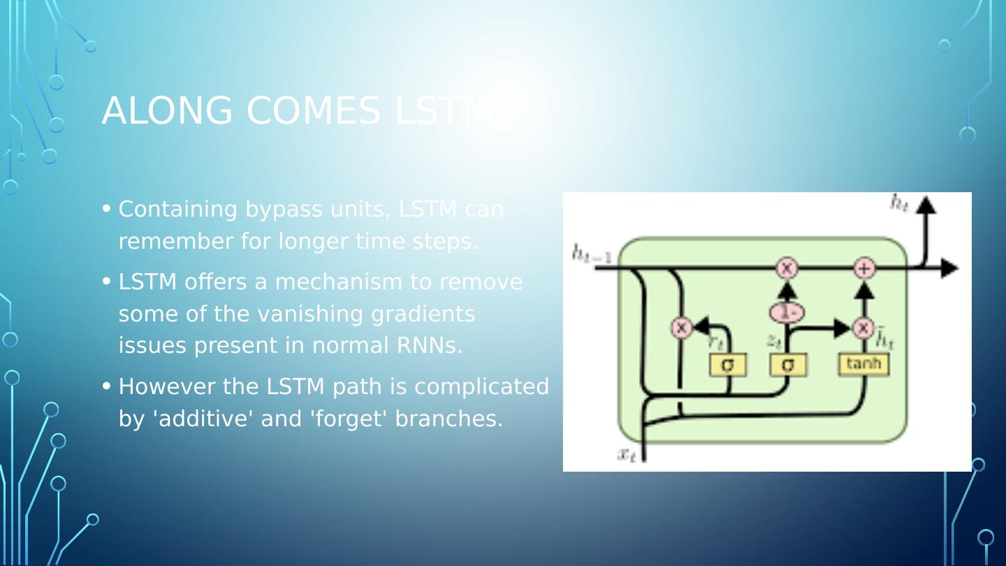 5 .Along comes LSTM Containing bypass units, LSTM can remember for longer time steps. LSTM offers a mechanism to remove some of the vanishing gradients issues present in normal RNNs. However the LSTM path is complicated by additive and forget branches.