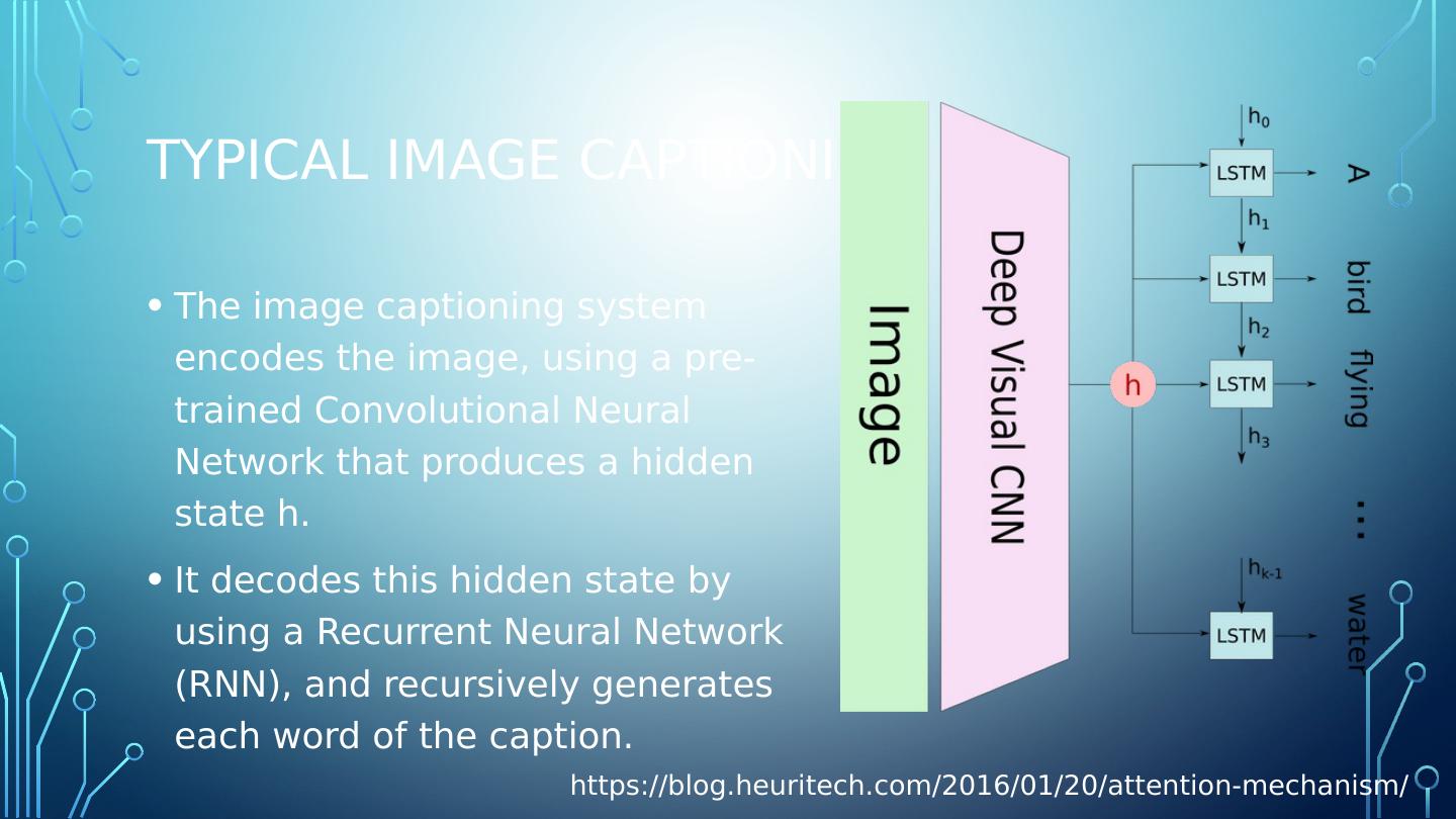 6 .Typical Image captioning The image captioning system encodes the image, using a pre-trained Convolutional Neural Network that produces a hidden state h. It decodes this hidden state by using a Recurrent Neural Network (RNN), and recursively generates each word of the caption. https://blog.heuritech.com/2016/01/20/attention-mechanism/