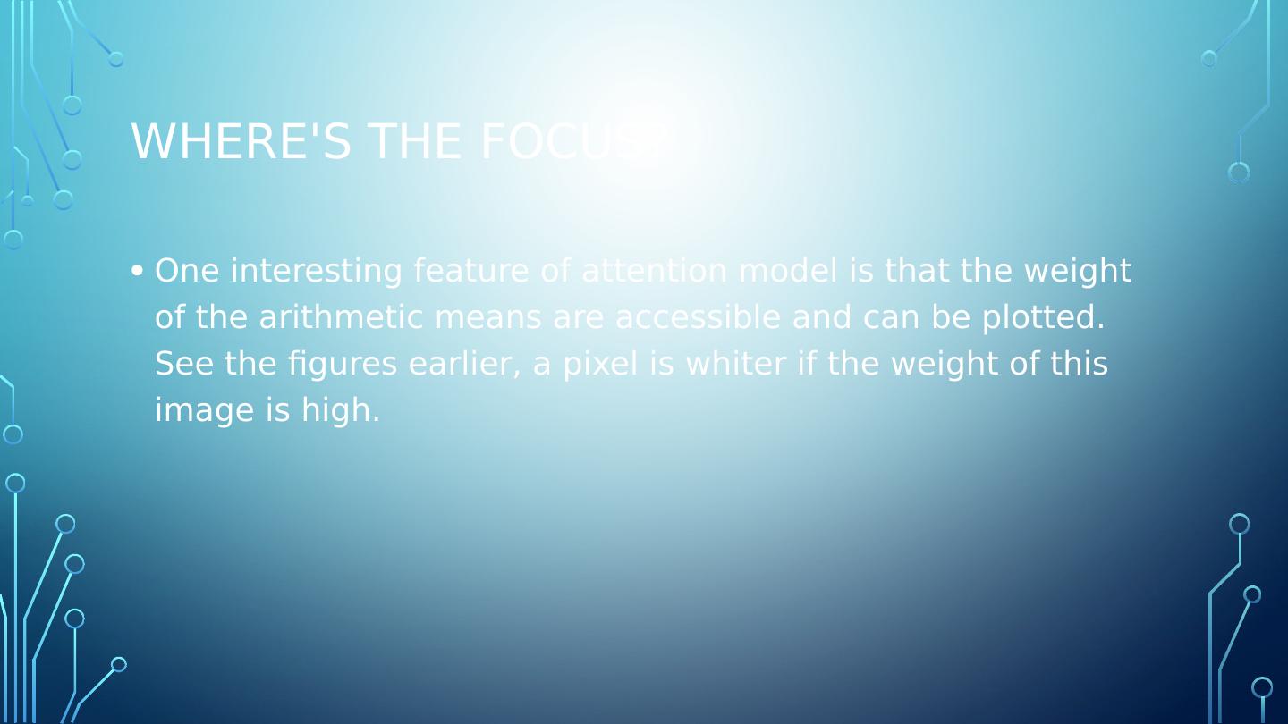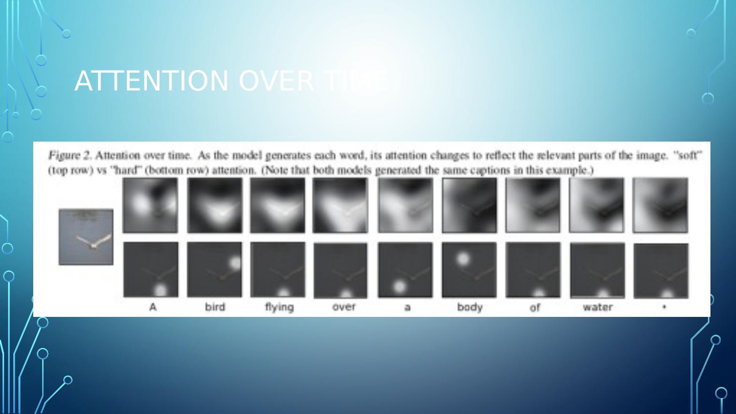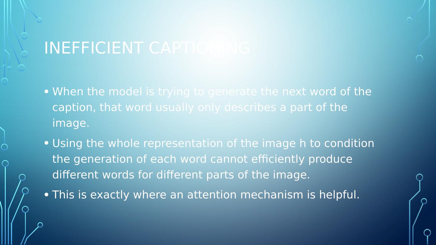 7 .Inefficient captioning When the model is trying to generate the next word of the caption, that word usually only describes a part of the image. Using the whole representation of the image h to condition the generation of each word cannot efficiently produce different words for different parts of the image. This is exactly where an attention mechanism is helpful.