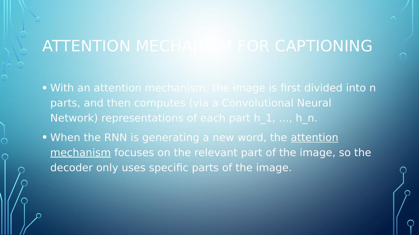8 .Attention mechanism for captioning With an attention mechanism, the image is first divided into n parts, and then computes (via a Convolutional Neural Network) representations of each part h_1, ..., h_n . When the RNN is generating a new word, the attention mechanism focuses on the relevant part of the image, so the decoder only uses specific parts of the image.