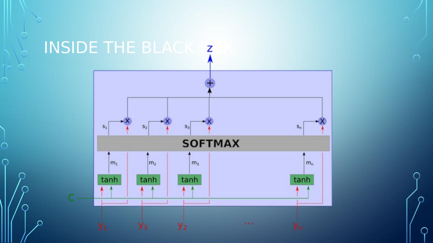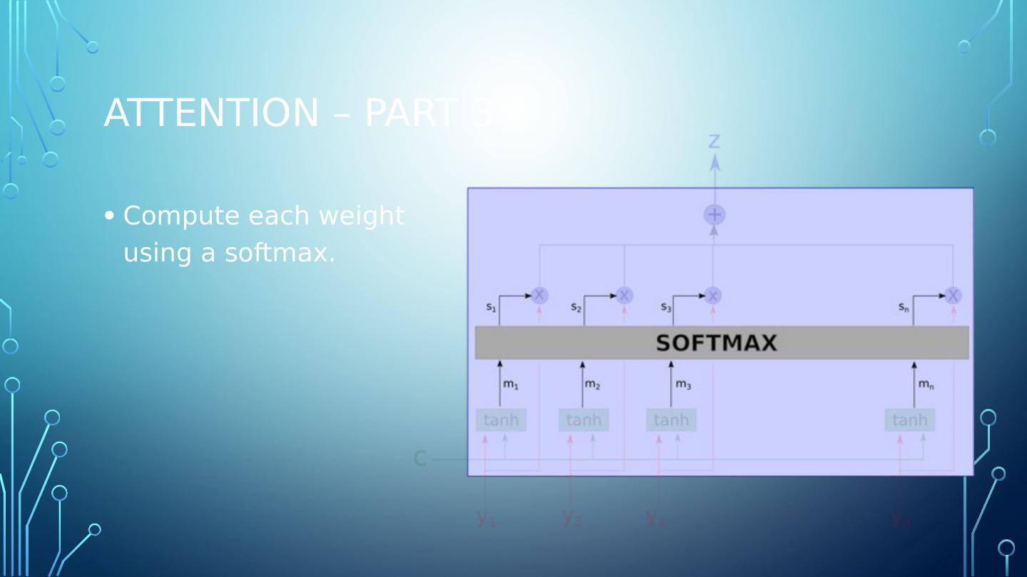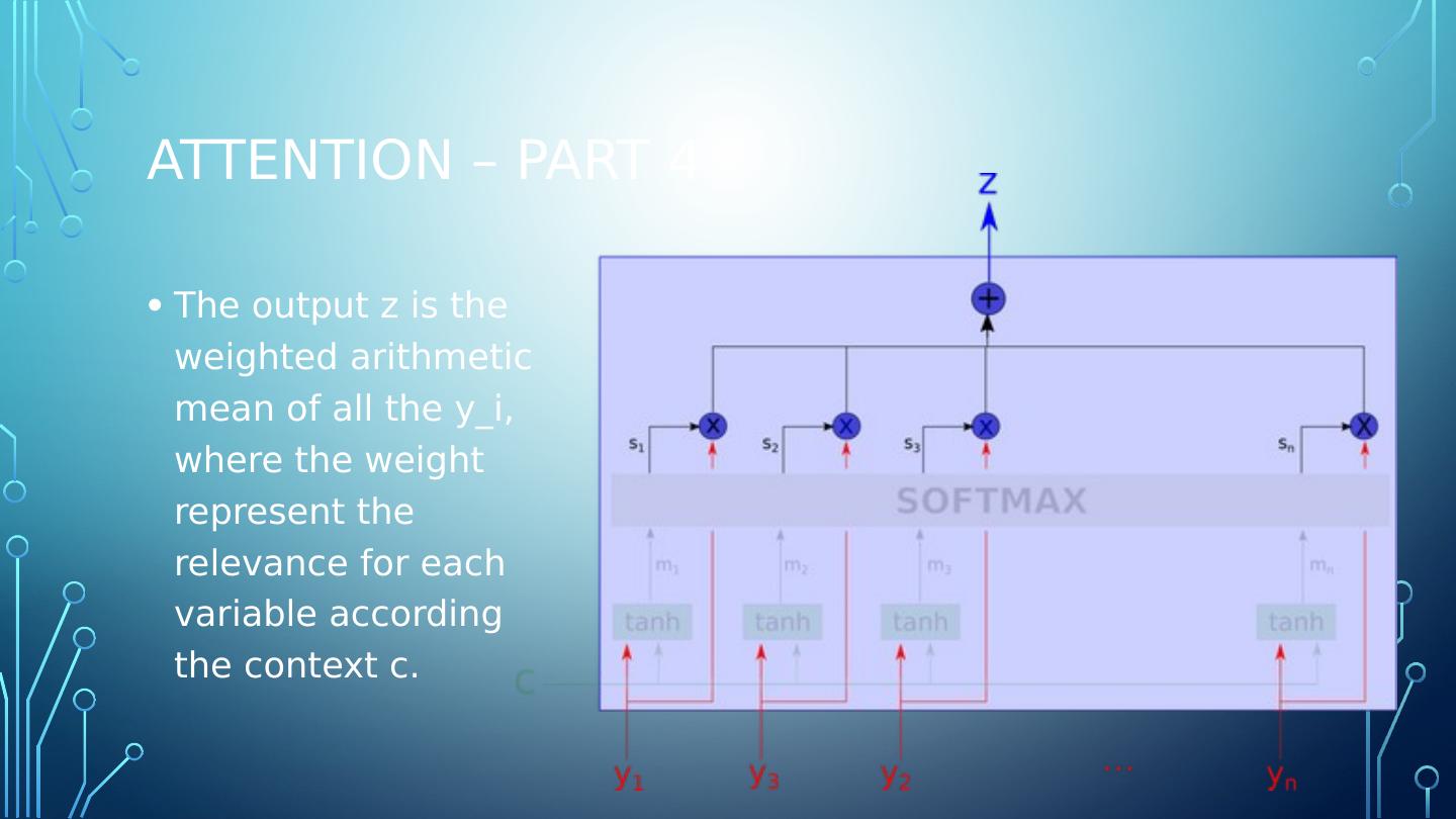 17 .Attention – part 4 The output z is the weighted arithmetic mean of all the y_i , where the weight represent the relevance for each variable according the context c.
