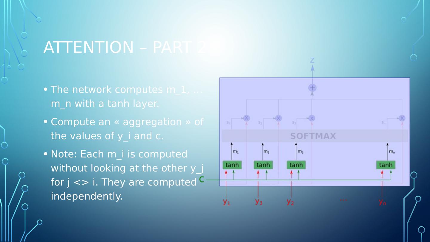 15 .Attention – Part 2 The network computes m_1, … m_n with a tanh layer. Compute an « aggregation » of the values of y_i and c. Note: Each m_i is computed without looking at the other y_j for j <> i . They are computed independently.