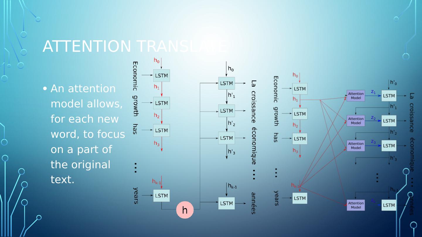 19 .Attention translate An attention model allows, for each new word, to focus on a part of the original text.