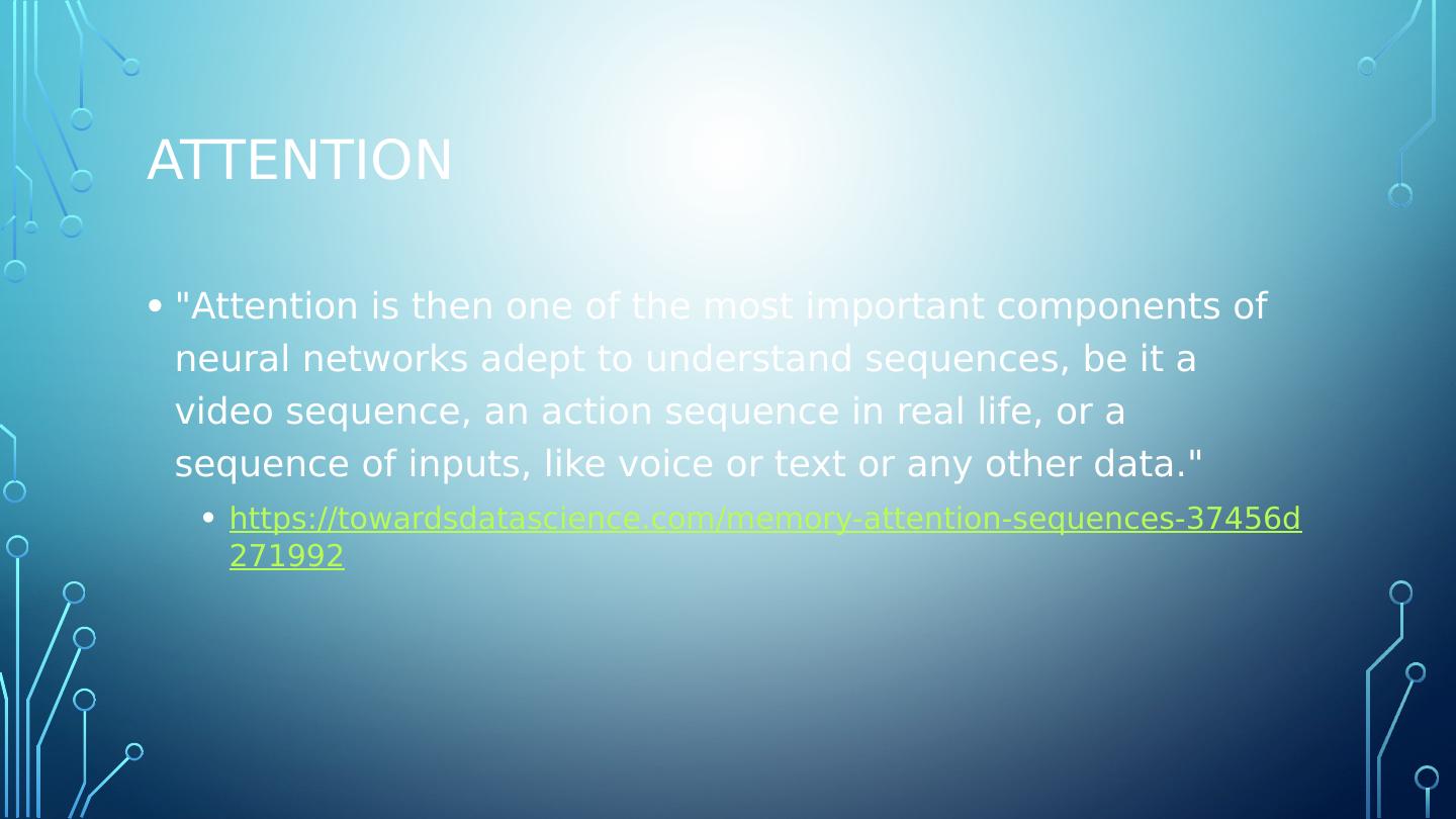 22 .attention "Attention is then one of the most important components of neural networks adept to understand sequences, be it a video sequence, an action sequence in real life, or a sequence of inputs, like voice or text or any other data." https://towardsdatascience.com/memory-attention-sequences-37456d271992