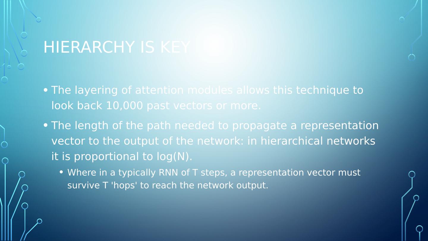 24 .Hierarchy is key The layering of attention modules allows this technique to look back 10,000 past vectors or more. The length of the path needed to propagate a representation vector to the output of the network: in hierarchical networks it is proportional to log(N). Where in a typically RNN of T steps, a representation vector must survive T hops to reach the network output.