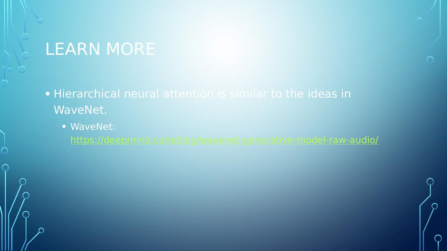 25 .Learn more Hierarchical neural attention is similar to the ideas in WaveNet . WaveNet : https://deepmind.com/blog/wavenet-generative-model-raw-audio/