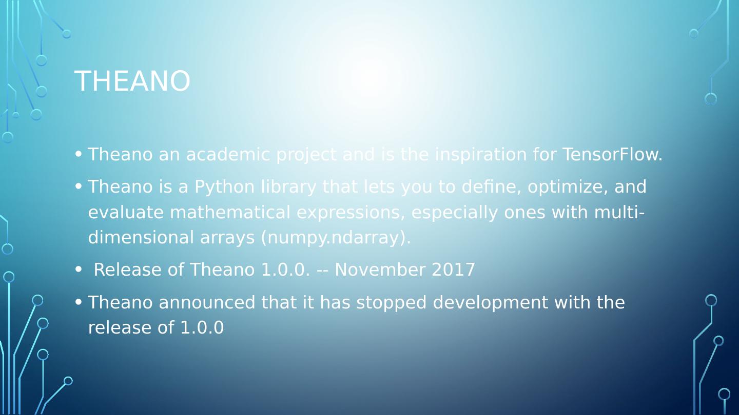3 .theano Theano an academic project and is the inspiration for TensorFlow . Theano is a Python library that lets you to define, optimize, and evaluate mathematical expressions, especially ones with multi-dimensional arrays ( numpy.ndarray ). Release of Theano 1.0.0. -- November 2017 Theano announced that it has stopped development with the release of 1.0.0