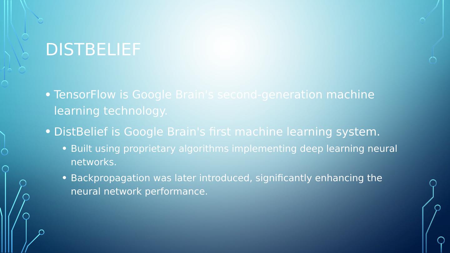 6 .Distbelief TensorFlow is Google Brains second-generation machine learning technology. DistBelief is Google Brains first machine learning system. Built using proprietary algorithms implementing deep learning neural networks. Backpropagation was later introduced, significantly enhancing the neural network performance.