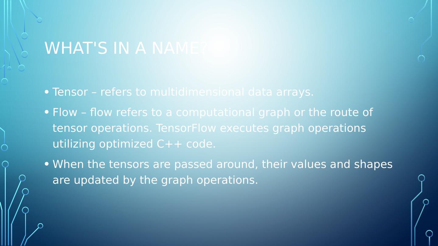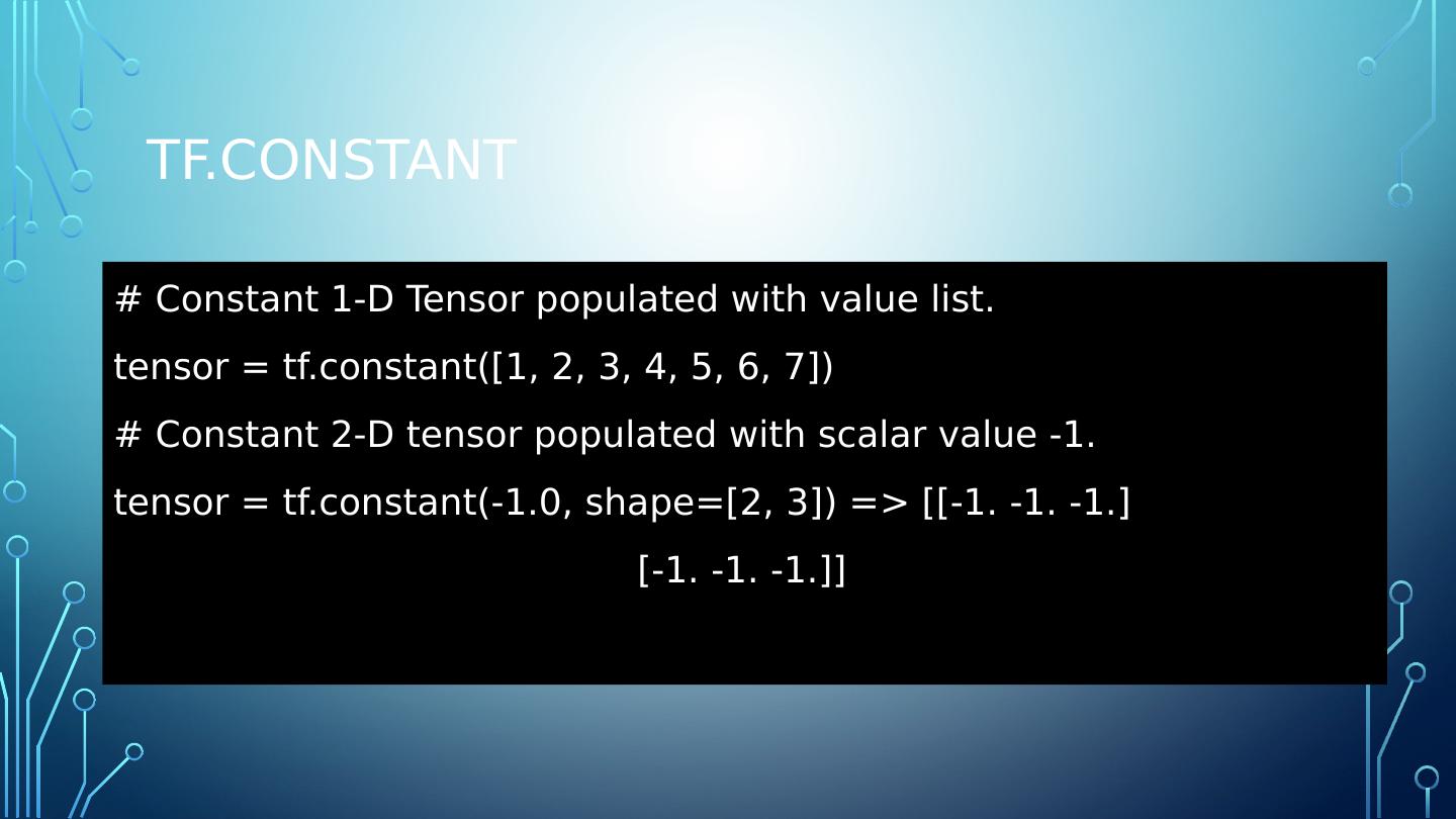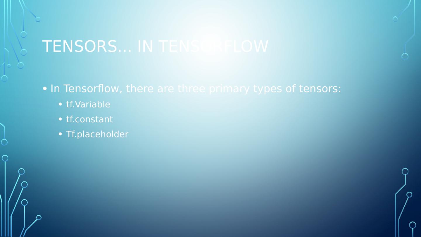 28 .Tensors... in tensorflow In Tensorflow , there are three primary types of tensors: tf.Variable tf.constant Tf.placeholder